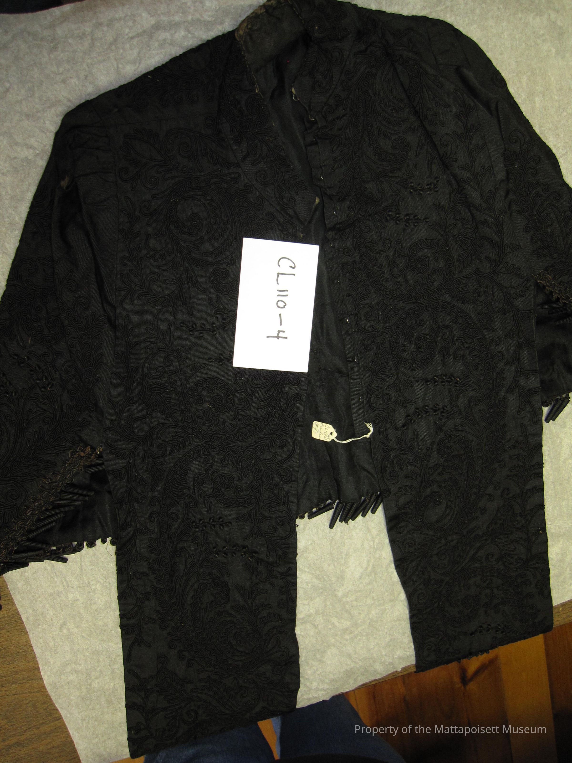 Short, fitted black evening wrap, embroidered, with long front panels. Owned by Katherine White, granddaughter of Peregrine White, married Isaac Bolles, grandfather of Minnie White.Collection