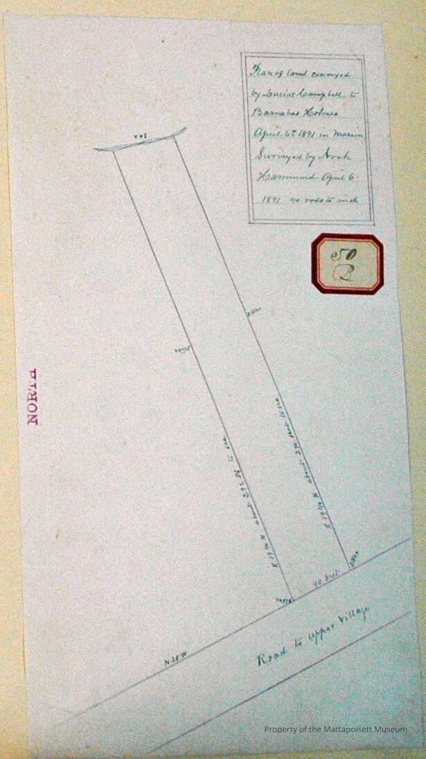 Plan of land conveyed by Lucius Campbell to Baranabas Holmes April 6th 1891 in Marion. Surveyed by Noah Hammond April 6, 1891. 40 rods to one inch. Road to Upper Village to the east.Acquisition