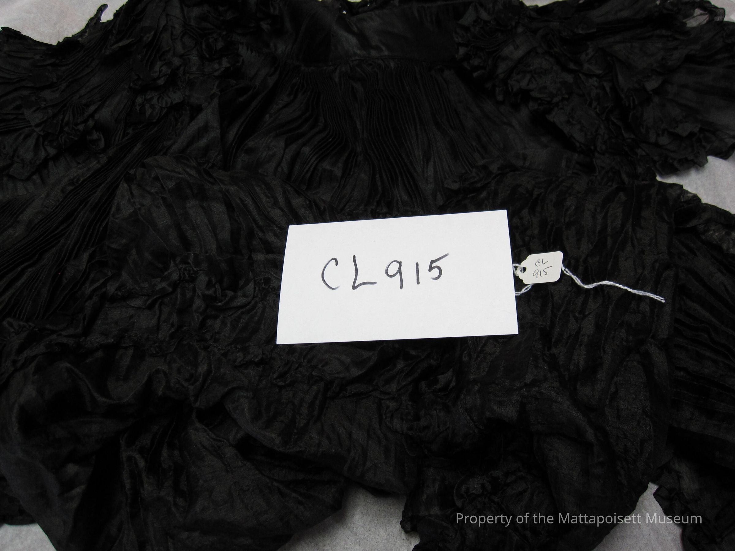 Notes: Notecard: Capelet. Black organza ruffled pleated detail. Long front, tails and ties.