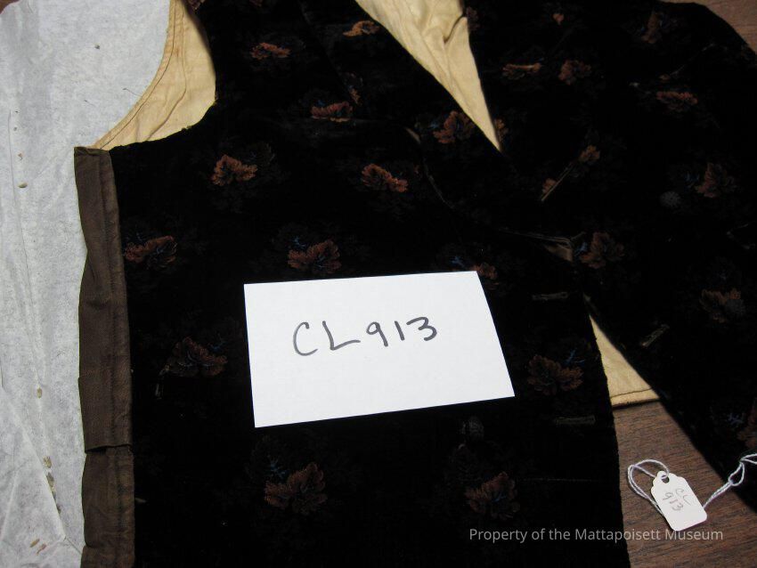 Men's velvet vest. Black with pattern of brown leaves, button closure.Collection