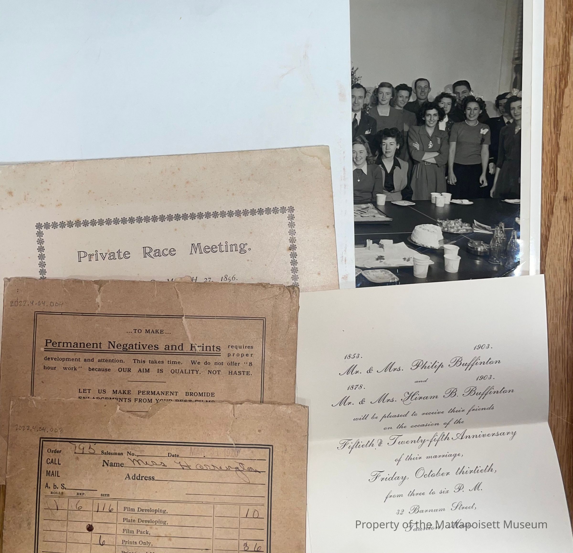 The folder contains two envelopes with photograph negatives, photographs of horses and stables, two larger photographs of groups of people, a wedding invitation, and a horse race program. There is a photo of a woman, possibly Marian Harrington, from 1893.Context