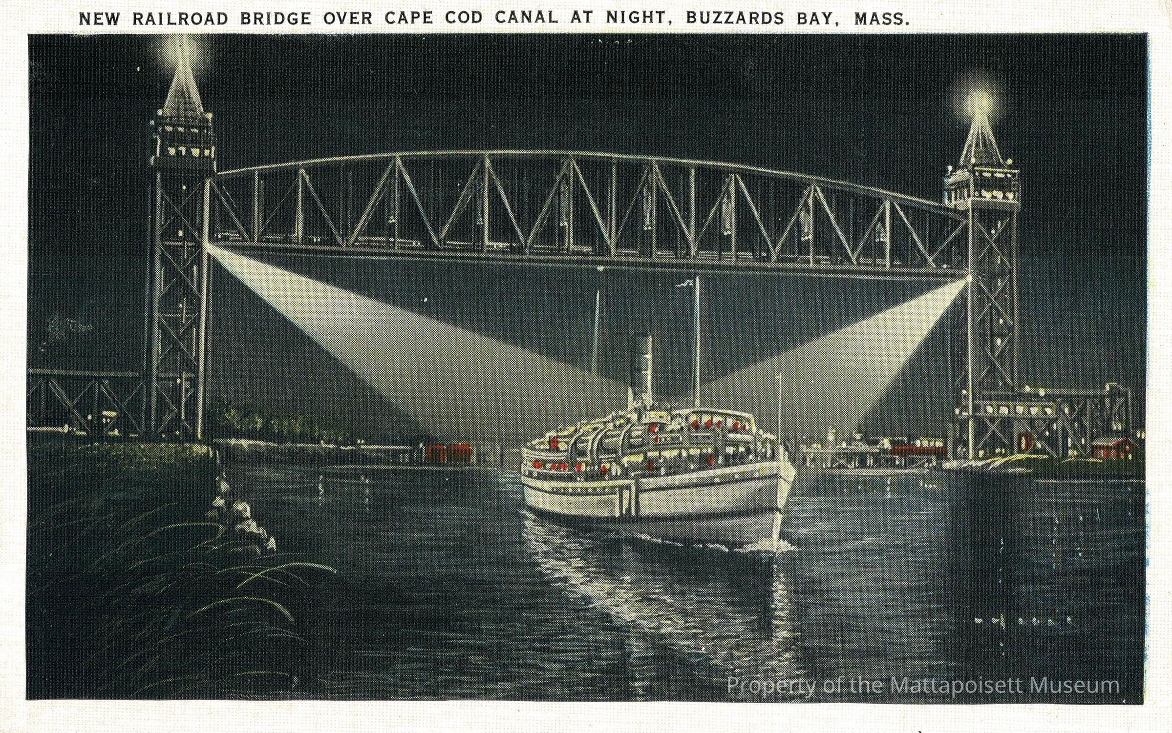 Hand-colored postcard showing New Railroad Bridge Over Cape Cod Canal At Night, Buzzards Bay, Mass.Collection