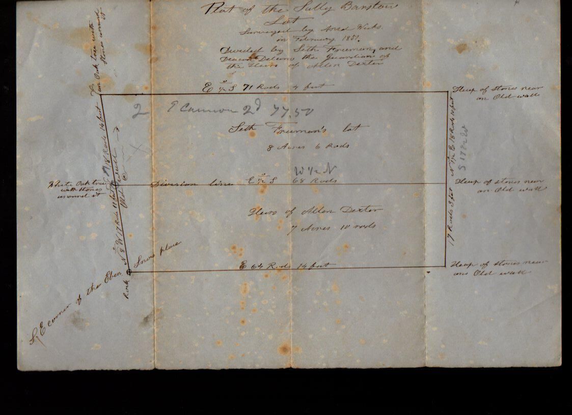 Plot of the Sully Barstow Lot, surveyed by Ansel Weeks. Deeded by Seth Freeman and Deacon Delano, the guardian of the heirs of Allen Dexter. Two parcels; 8 acres and 6 rods, 7 acres and 10 rods.Collection