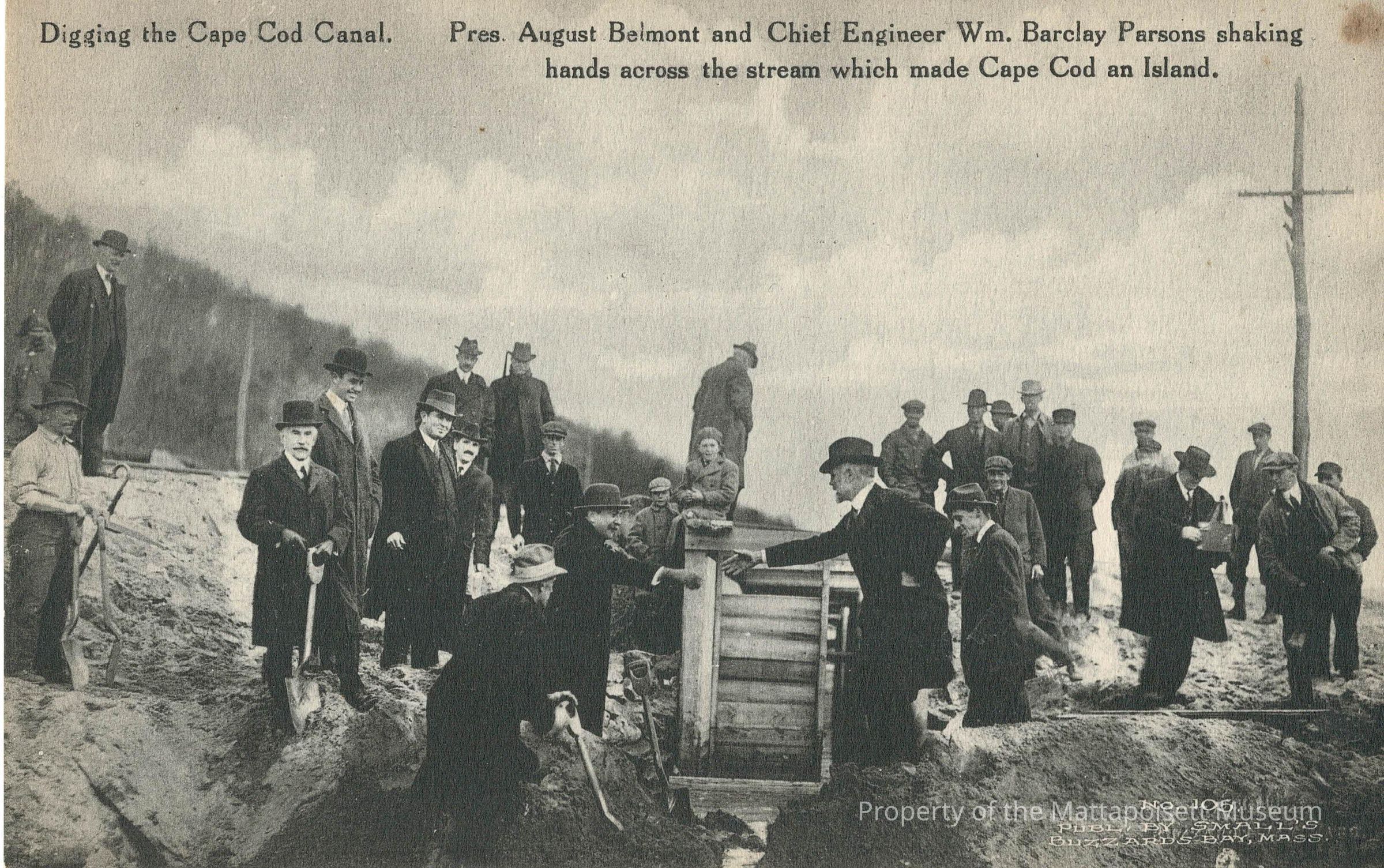 Black and white postcard showing Digging the Cape Cod Canal. Pres. August Belmont and Chief Engineer Wm. Barclay Parsons shaking hands across the stream which made Cape Cod an Island.Collection