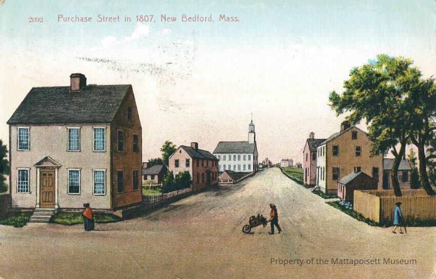 Hand-colored postcard showing Purchase Street in 1807, New Bedford, Mass. Handwritten note to Andrew L. (last name not legible), Norway, Maine. Postmarked September 19, 1907 from New Bedford, Mass. Received Norway, Maine on September 30, 1907.Collection
