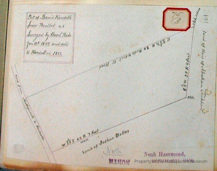 Plot of Lewis Randall's Snow woodlot as surveyed by Ansel Weeks, January 15th 1849 and sold to Randall in 1851. On road from Mattapoisett to Rochester. Abutters: Heirs of Abraham Tinkham and Joshua Bolles.Acquisition