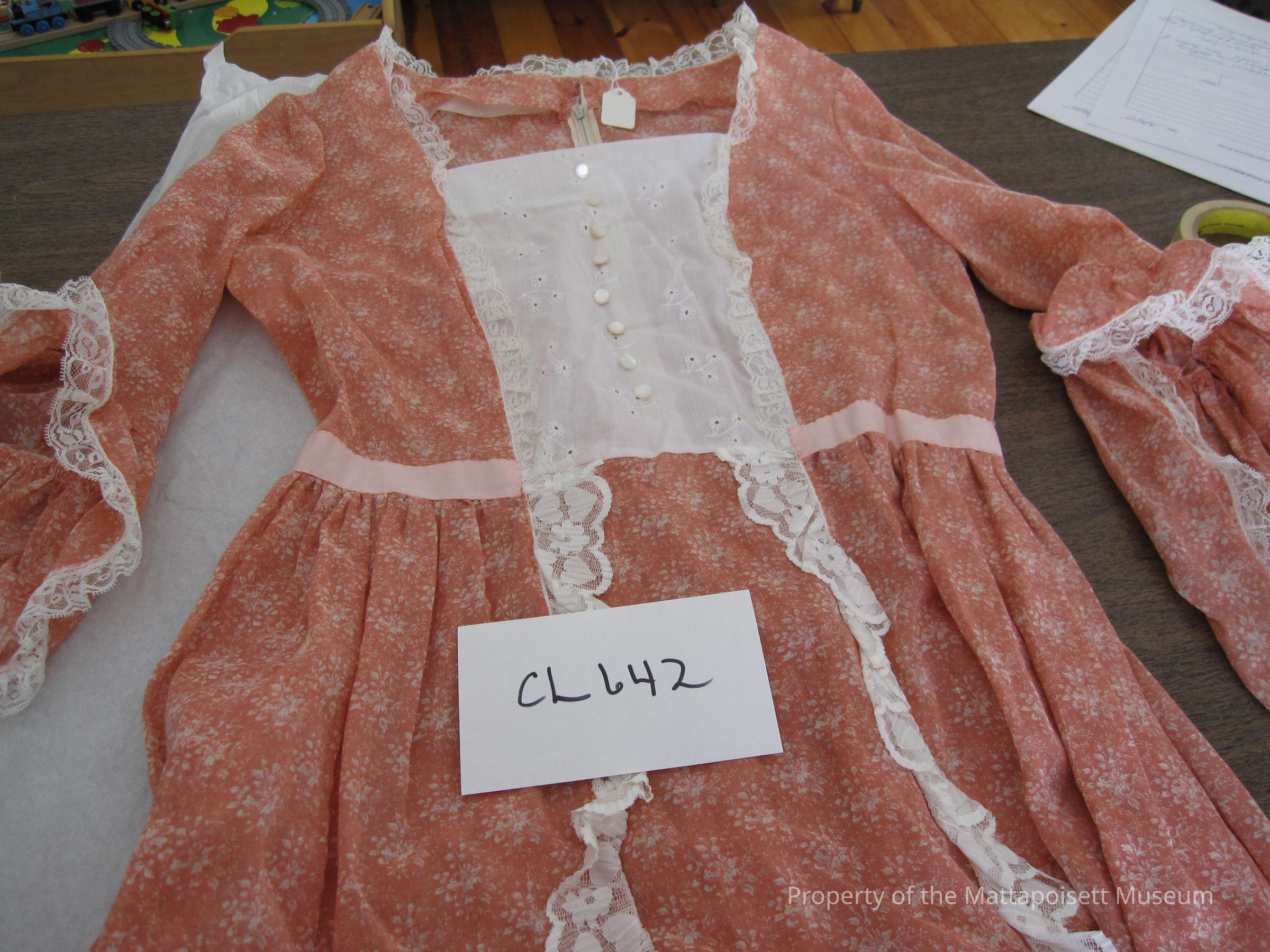 Women's Bicentennial Costume. Long pink cotton voile dress (matching scarf not found) White eyelet on bodice insert, lace on cuffs and neck.Collection
