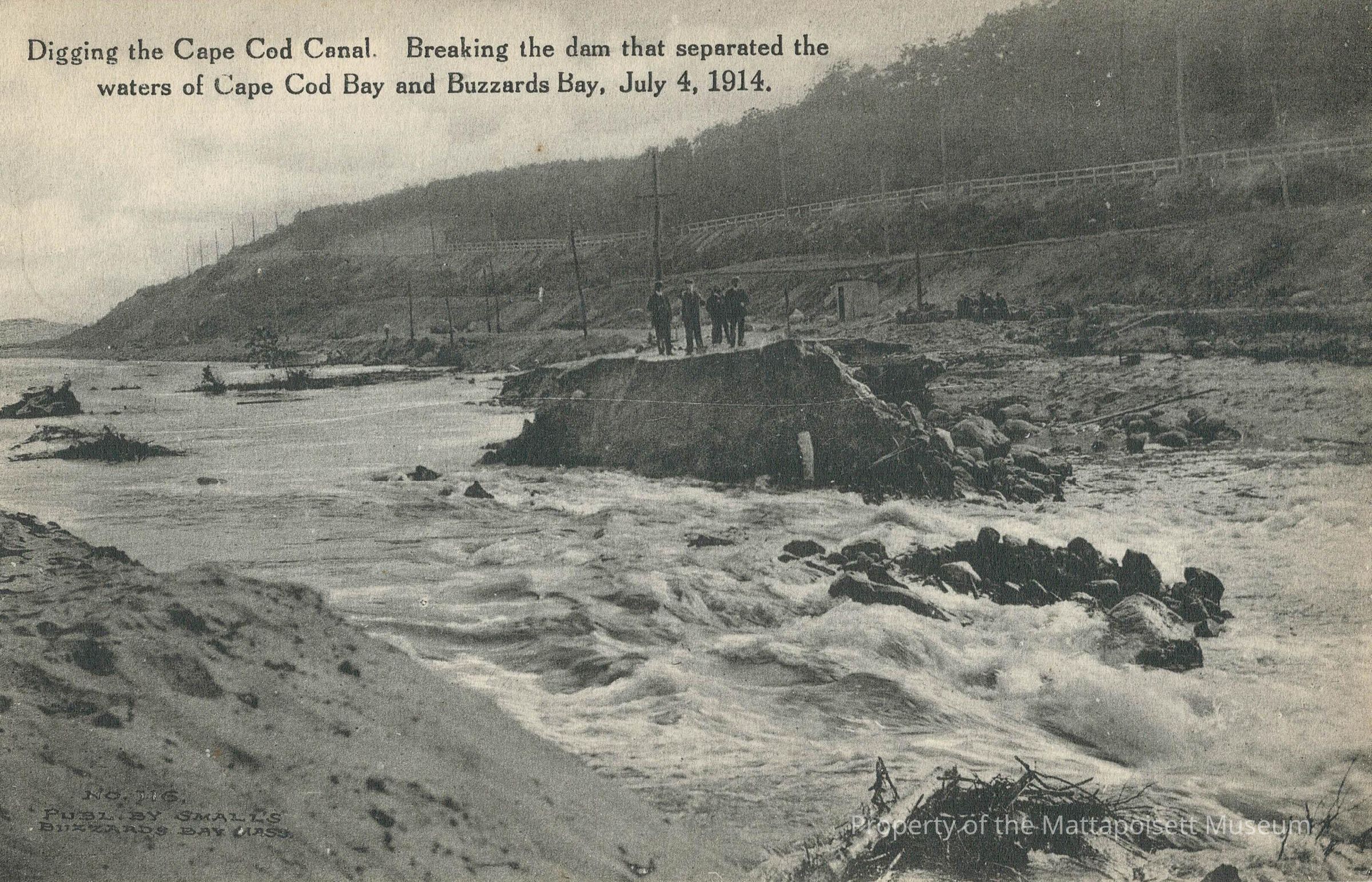 Black and white postcard showing Digging the Cape Cod Canal. Breaking the dam that separated the waters of Cape Cod Bay and Buzzards Bay, July 4, 1914.Collection