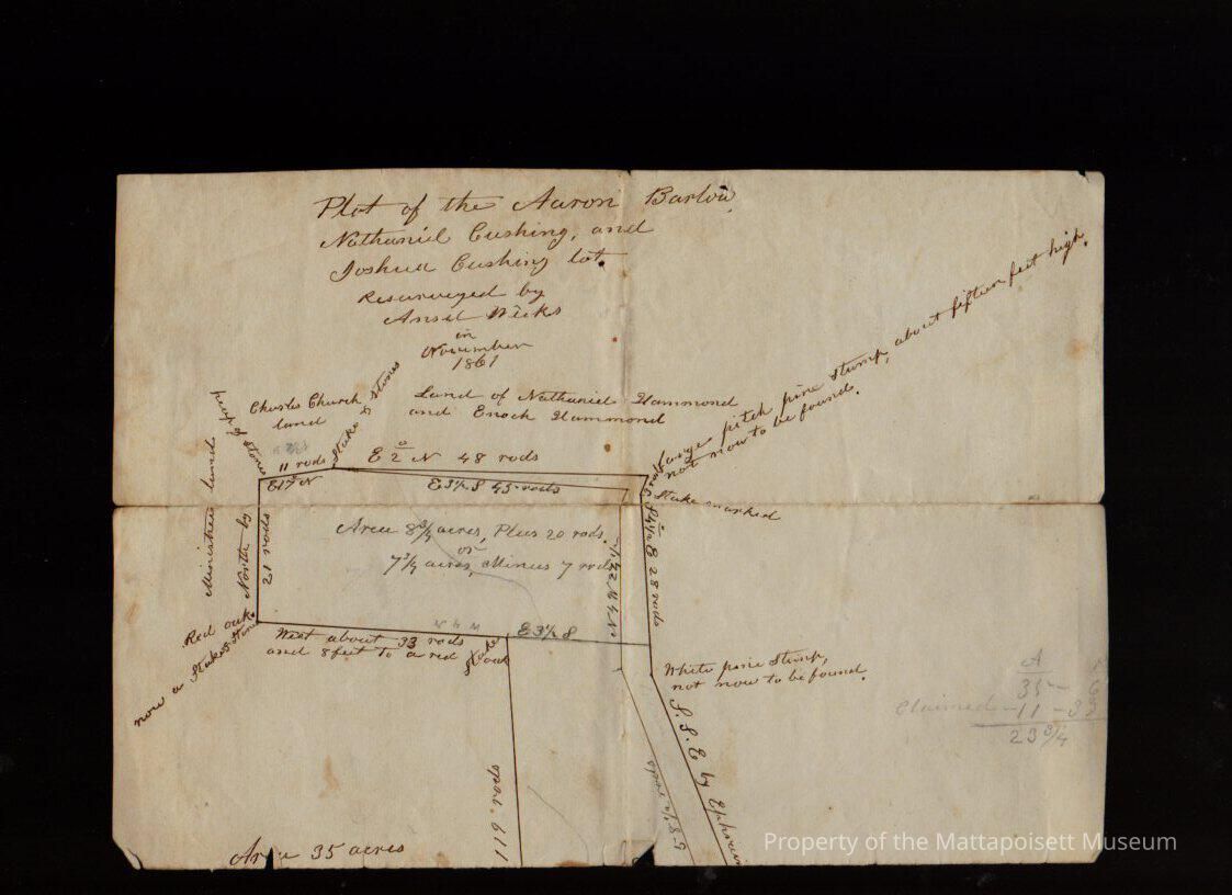 Plot of the Aaron Barlow, Nathaniel Cushing and Joshua Cushing lot, resurveyed by Ansel Weeks. Area 8 3/4 acres and 20 rods.Collection