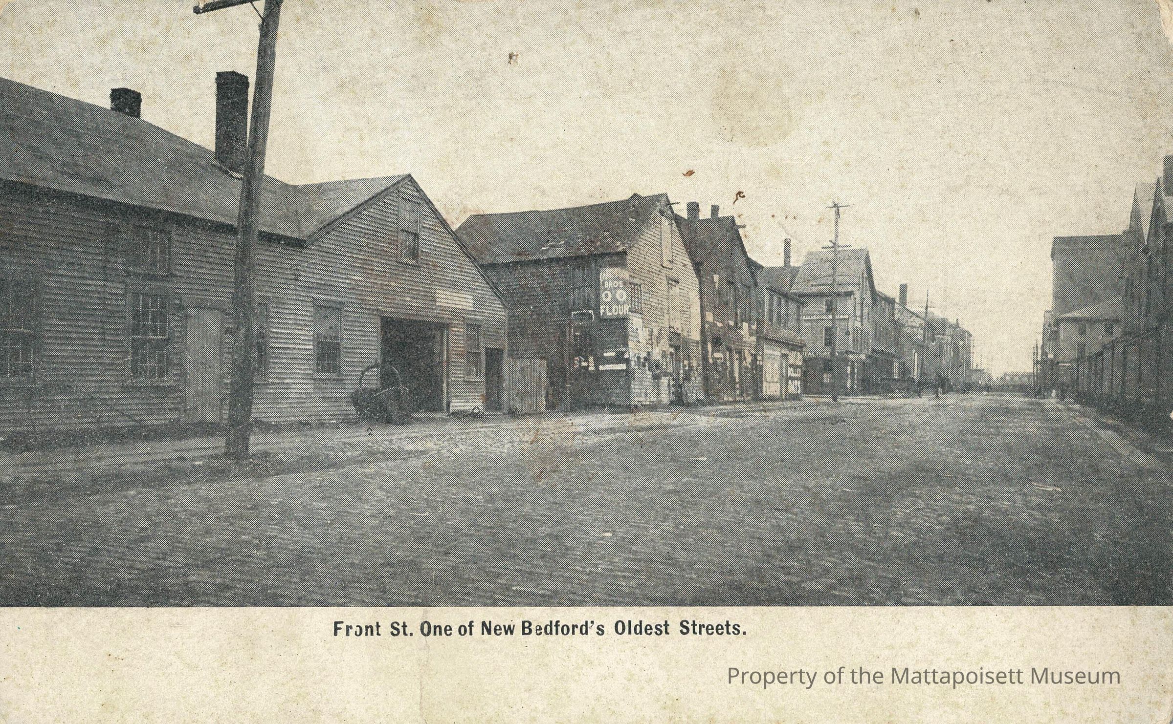 Black and white postcard showing Front St. One of New Bedford's Oldest Streets.Collection