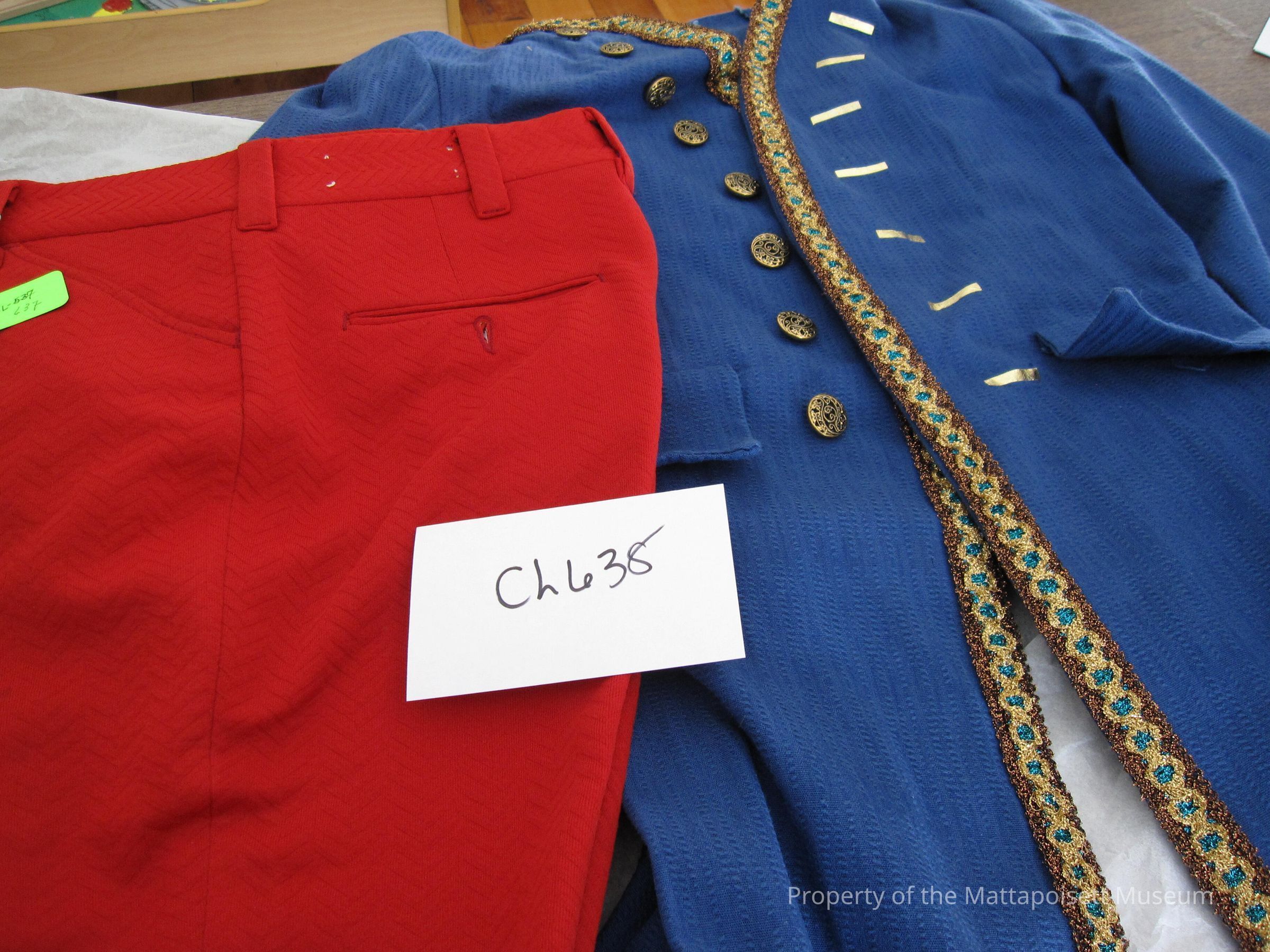 Men's two-piece Bicentennial costume. Original card says three-piece, but only jacket and pants in Box 35. Blue jacket, red trim, brass filigreed buttons. "Gaudy trim", two pockets. Red pants, brass pants.Collection