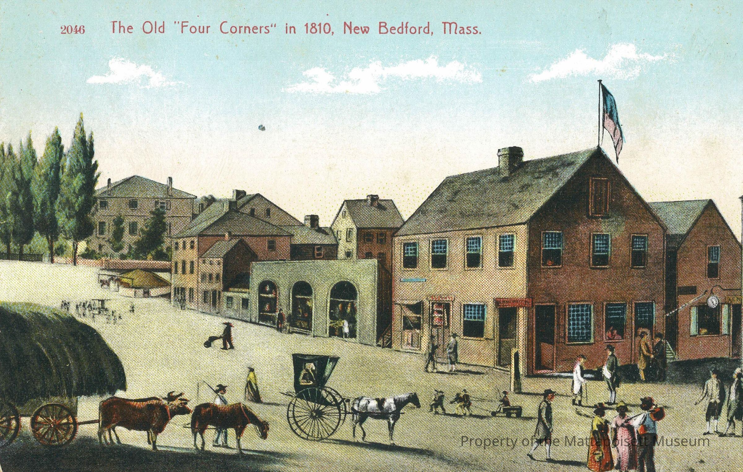 Hand-colored postcard showing The Old "Four Corners' in 1810, New Bedford, Mass.Collection