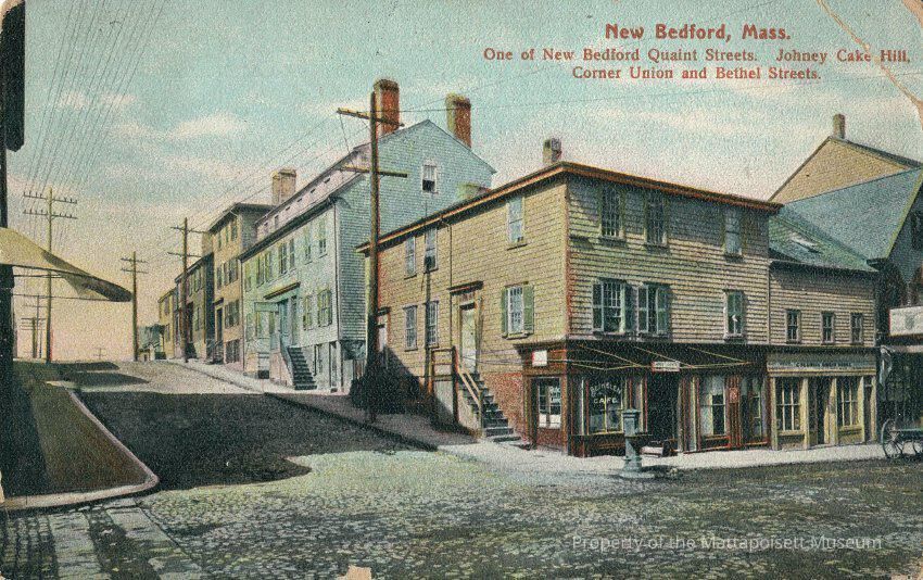 Hand-colored postcard showing New Bedford, Mass., One of New Bedford Quaint Streets. Johnny Cake Hill, Corner Union and Bethel Streets. Handwritten note to Miss Clara F. Millory, Oxford, Ohio. Postmarked from Boston, Mass. on February 1, 1909.Collection