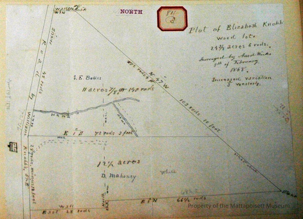 Plot of Elizabeth Knobb wood lot. 24 3/8 acres, 6 rods (total). Surveyed by Ansel Weeks, February 5, 1868. Increased variation 3 degrees westerly. Two sections, North - S. E. Bolles with11 acres, 150 rods and South - D. Mahoney with 12 1/2 acres. On road by William Knobb's.Acquisition