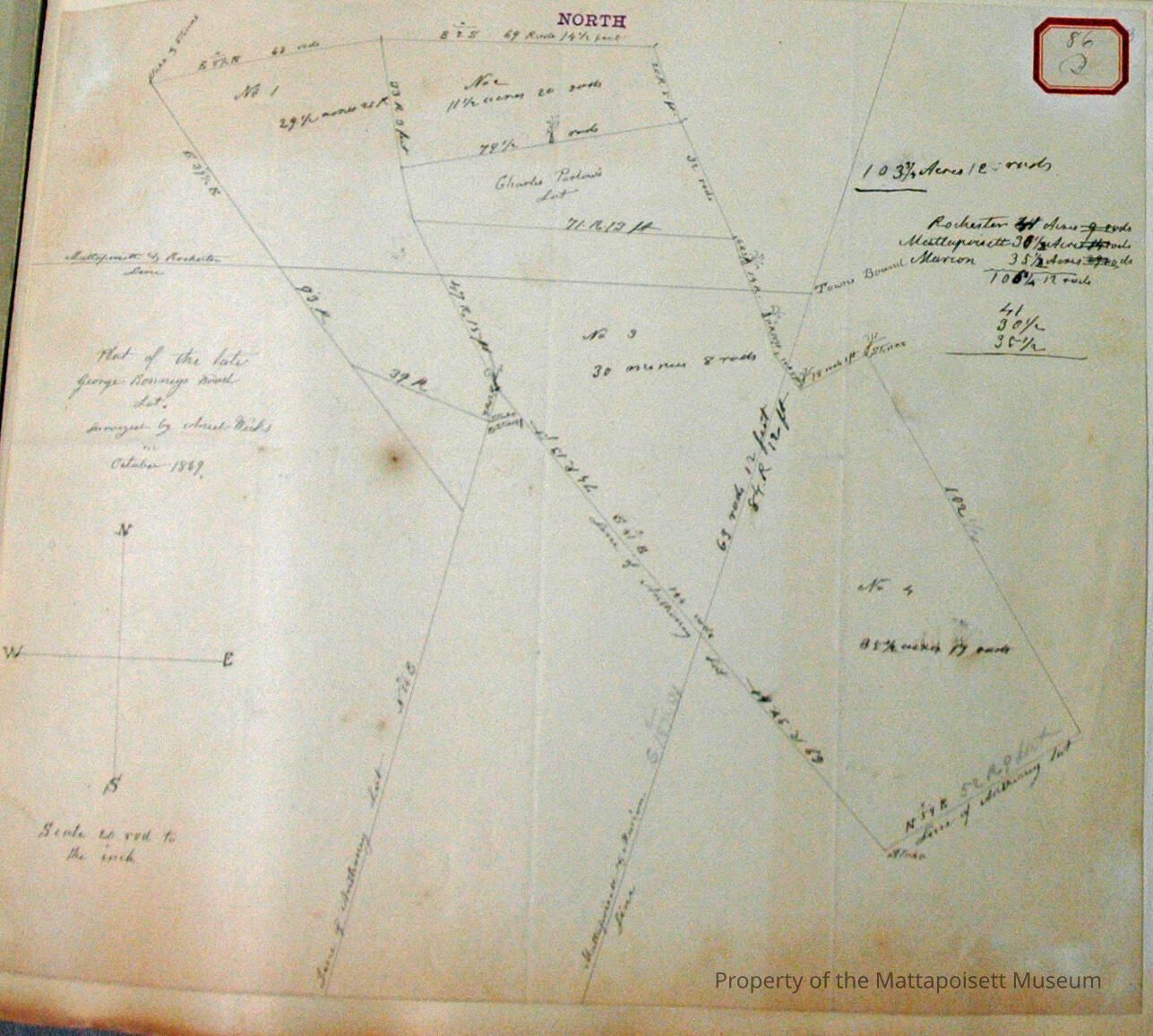 Plot of the late George Bonney's wood lot, located near Rochester, Mattapoisett and Marion town boundries. Surveyed by Ansel Weeks October 1869. 4 sections. Scale: 20 rods to one inch.Acquisition