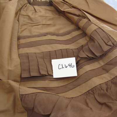 Two-piece toast/caramel-colored dress. Cotton with brown pleated trim on skirt and long jacket. Crochet covered buttons. Hand stitching.Collection