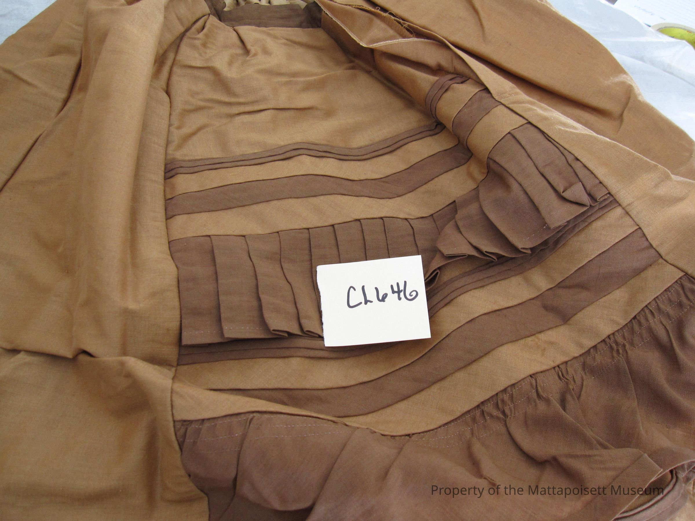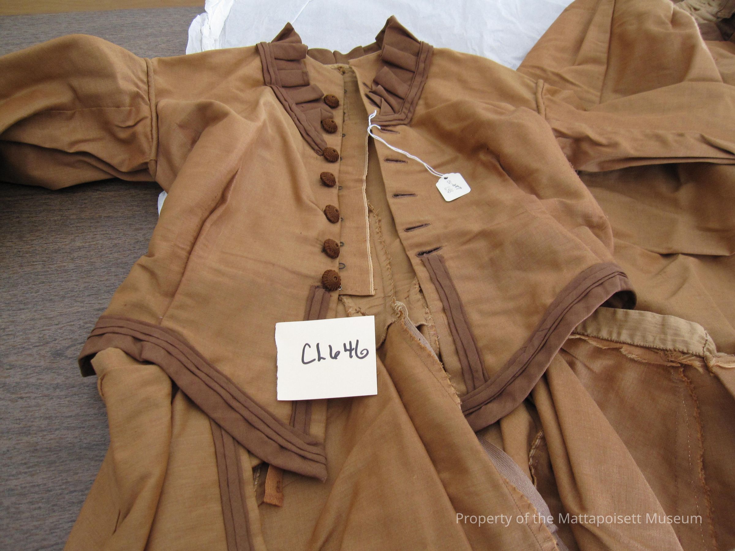 Notes: Notecard: Two piece toast-colored dress. Cotton with brown pleated trim on skirt and long jacket. Crochet covered buttons. Hand stitching.