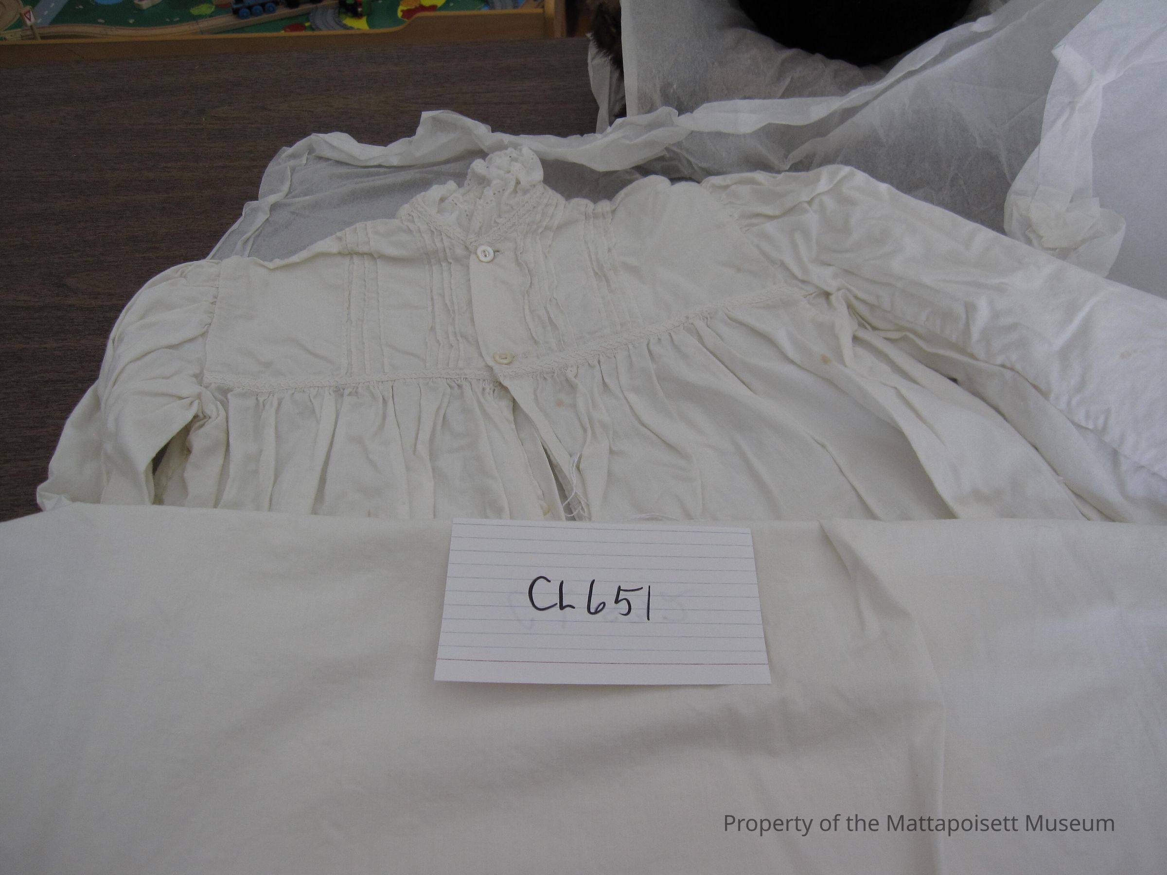 Child's long white nightgown. Pin-tucked bodice, small bit of embroidery, lace on collar and cuffs. Pearlized buttonsCollection