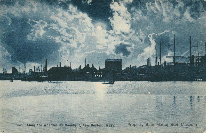 Black and white postcard showing Along the Wharves by Moonlight, New Bedford, Mass.Collection