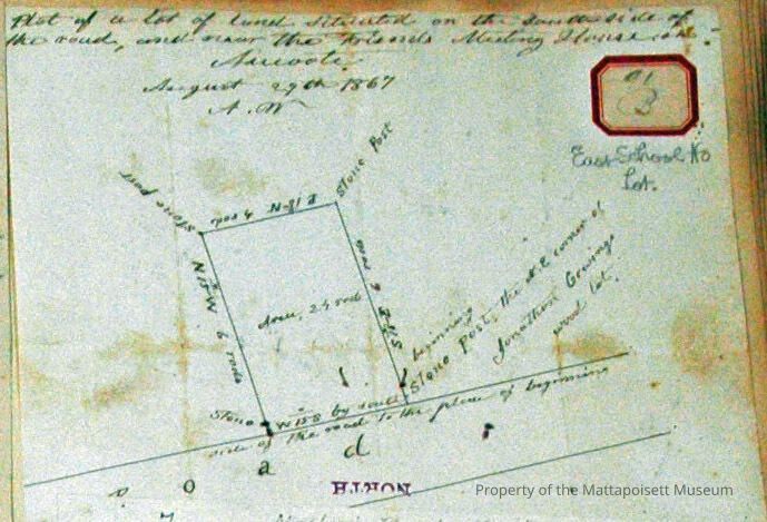 Plot of land situated on the south side of the road, and near the Friends' Meeting House, Aucoot. East School House lot, Mattapoisett. August 29th, 1867, surveyed by Ansel Weeks. One post at Northeast corner of Jonathan Cowing's lot.Acquisition