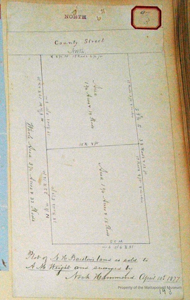Plot of N. H. Barstow's land as sold to A. M. Wright and surveyed by Noah Hammond, April 10, 1877. On Country Street. Two sections, total area 3 1/2 acres, 32 rods.Acquisition