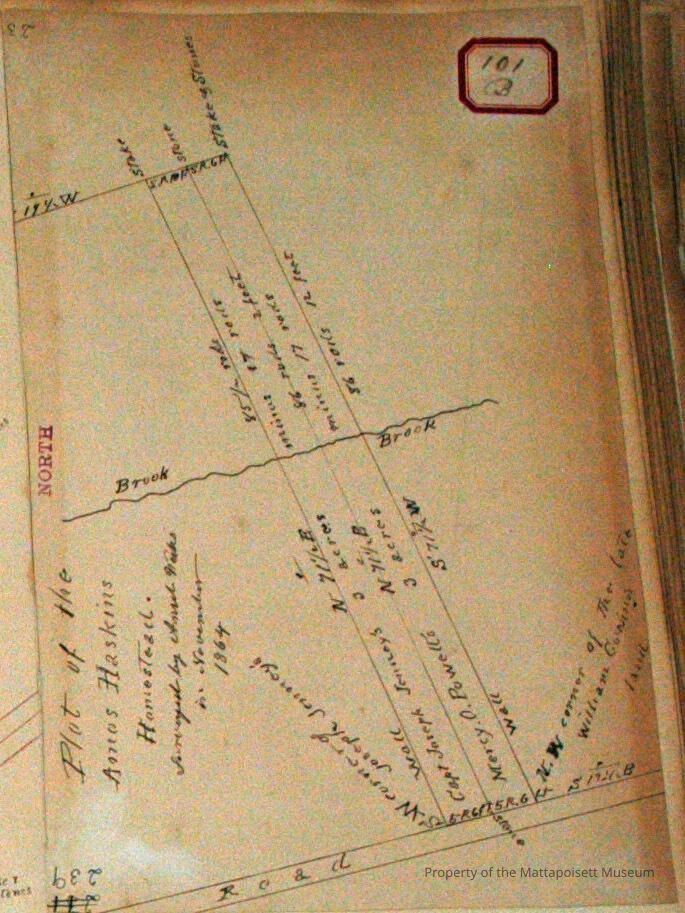 Plot of the Amos Haskins Homestead. Surveyed by Ansel Weeks in November 1864. Divided to Capt. Joseph Jenney (3 acres, minus 17 rods) and Mercy O. Powell (3 acres, minus 17 rods). Corner is on late William Cowing's land. On road, brook runs through.Acquisition