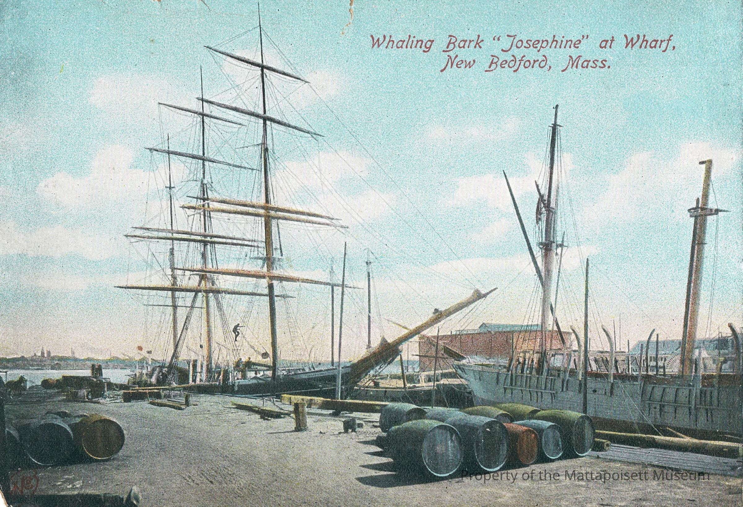 Hand-colored postcard showing Whaling Bark "Josephine" at Wharf, New Bedford, Mass.Collection
