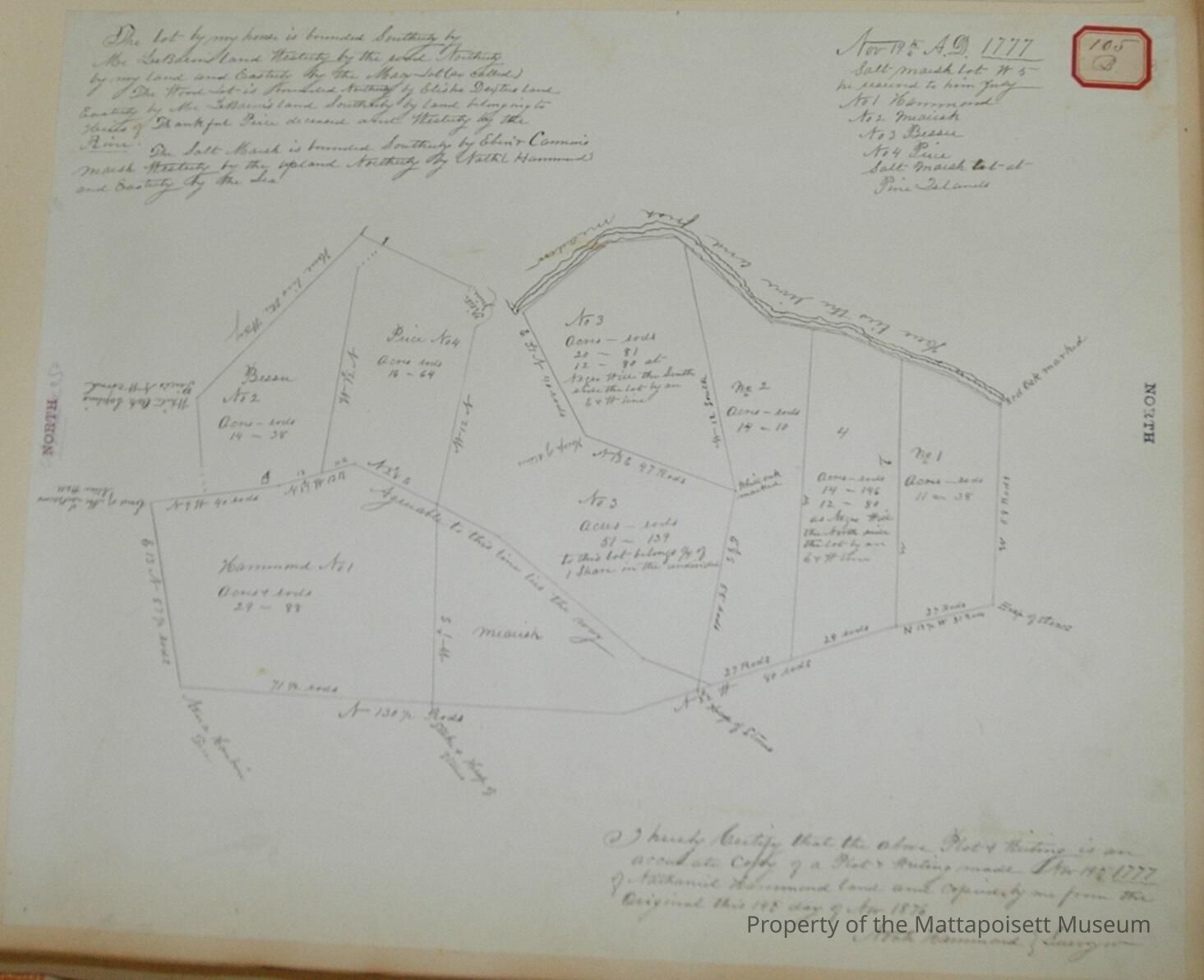 River and fresh meadow. November 19th A.D. 1777. Salt-marsh lot W5, be reserved to him July. No. 1 Hammond, No. 2 Miausk, No. 3. Bessie, No. 4 Price, Salt-marsh lot at Pine Island.Acquisition
