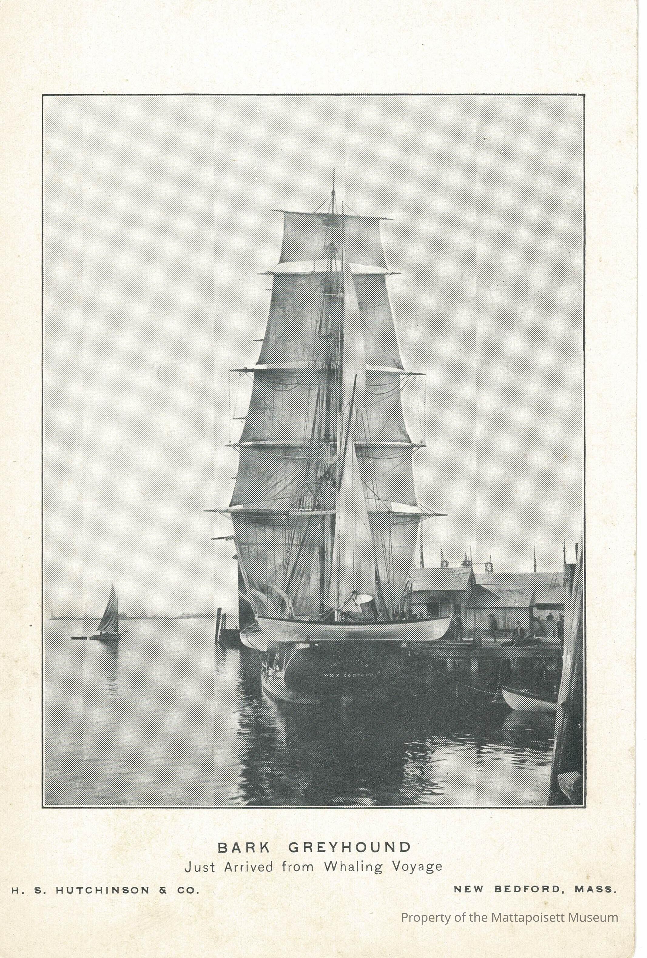 Black and white postcard showing Bark Greyhound, Just Arrived from Whaling Voyage.Collection