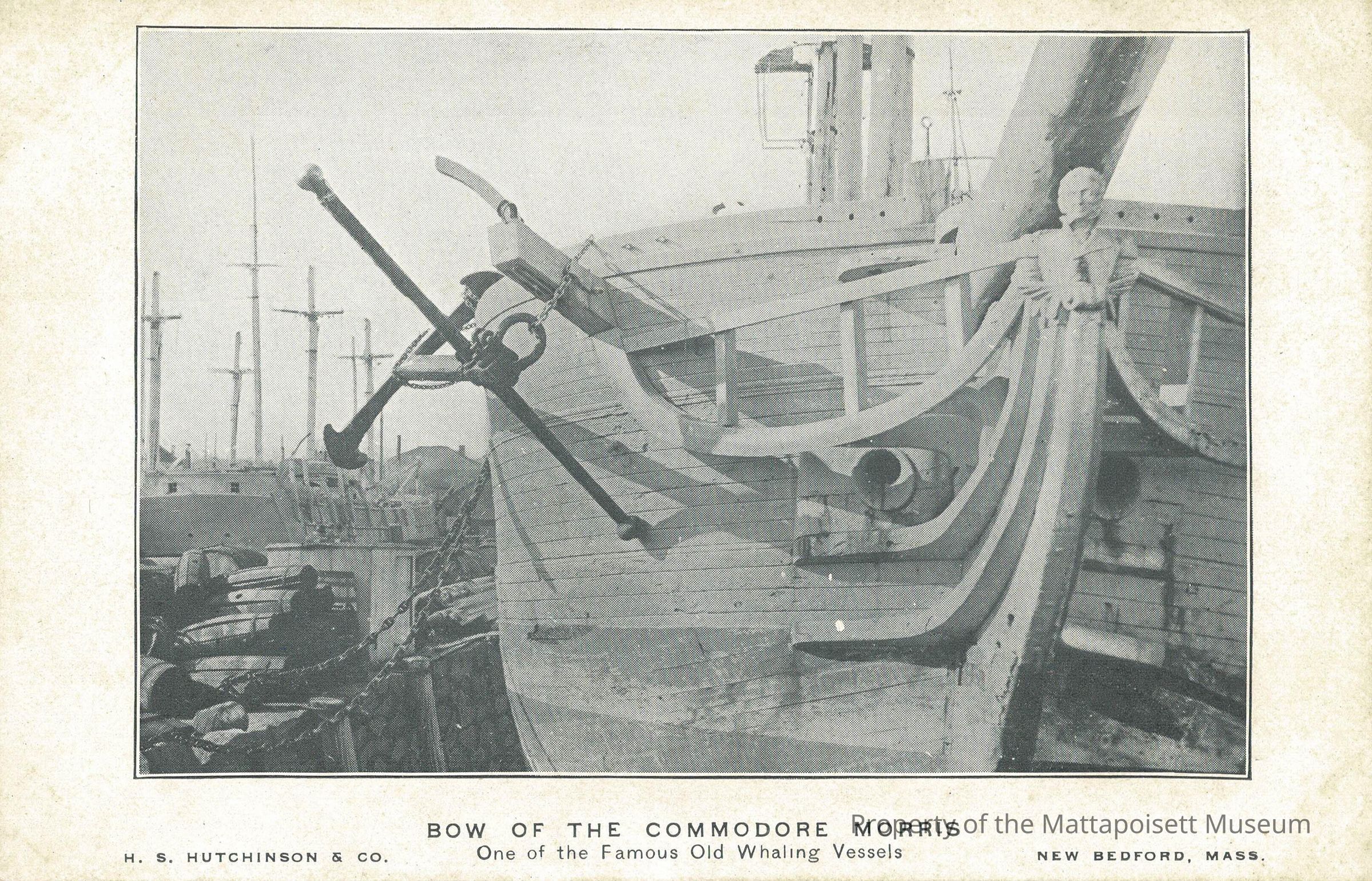 Black and white postcard showing Bow of the Commodore Morris, One of the Famous Old Whaling Vessels.Collection