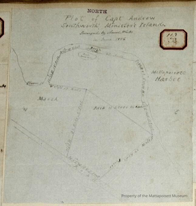 Plot of Capt. Andrew Southworth, Minister's Island. Surveyed by Ansel Weeks in June 1856. Area: 11 acres, 56 rods on Mattapoisett Harbor.Acquisition