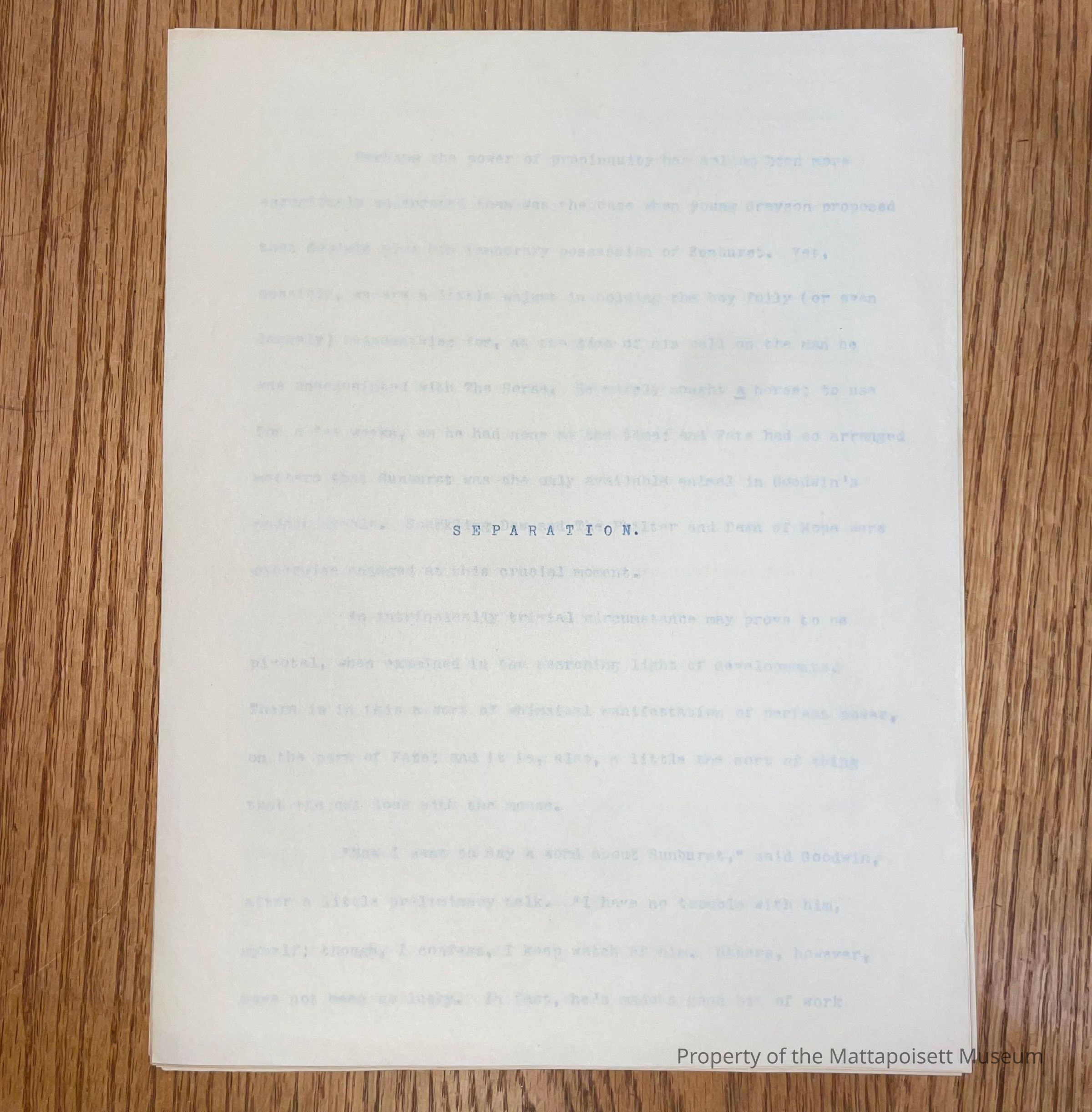 Harrington is a published author who spent his summers writing in Mattapoisett. The first book he published was a short story collection about horses called "A Reversion of Form" in 1911. 2022.4.03 is the manuscript series.
