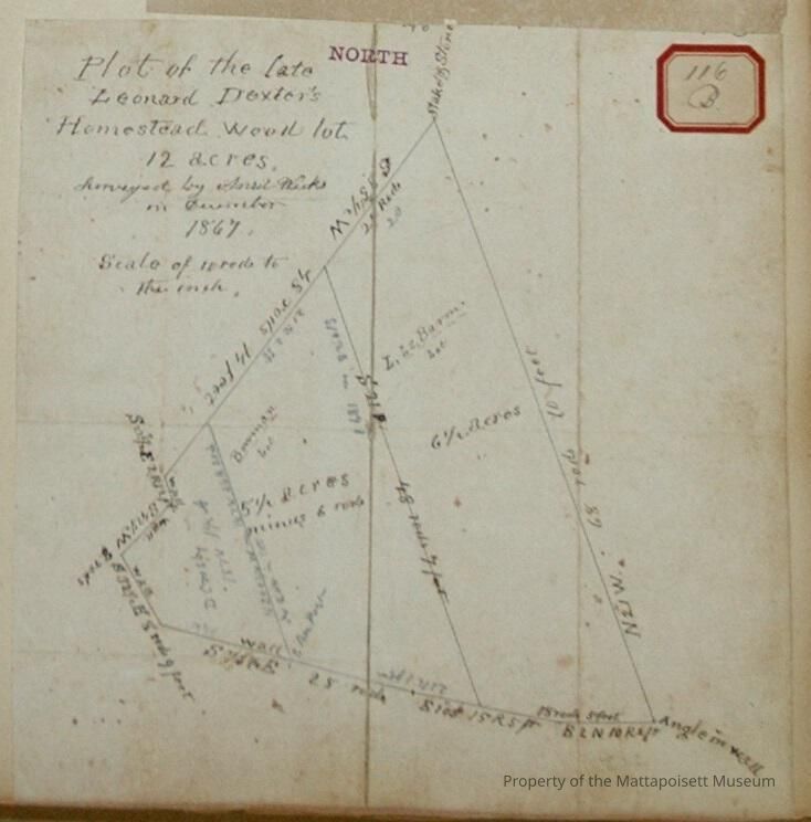 Plot of the late Leonard Dexter's Homestead wood lot, 12 acres. Surveyed by Ansel Weeks in December 1867. Scale of 10 rods to the inch. Several divisions: L. LeBaron lot (6 1/2 acres), D. Crosby (1878 - 1 1/2 acres), Bowman lot (5 1/2 acres, minus 6 rods)Acquisition