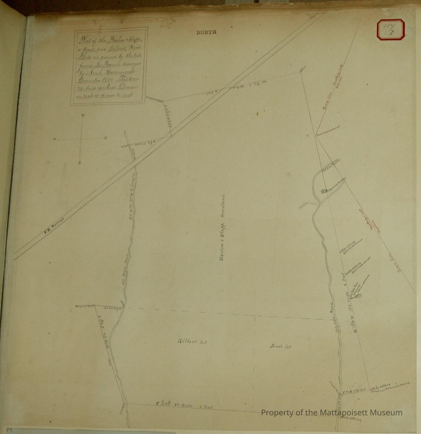 Plot of the Barlow and Clapp and Jones and Gilbert wood lots as owed by the late James Le Baron surveyed by Noah Hammond, December 1884. Total area 78 acres, 120 rods. Drawn on scale of 10 rods to inch. Fairhaven Branch Railroad, Old Road to Rochester cross. Near Mattapoisett/Marion town line.Acquisition