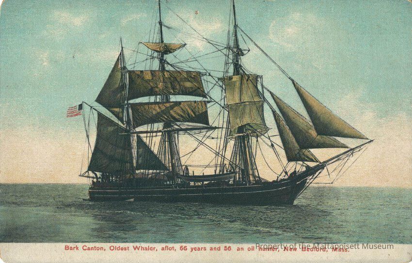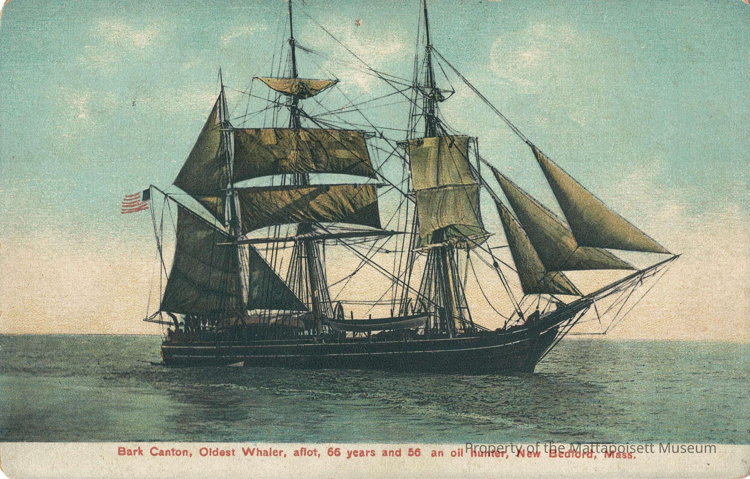 Hand-colored postcard showing Bark Canton, Oldest Whaler, aloft, 66 years and 56 an oil hunter, New Bedford, Mass.Collection