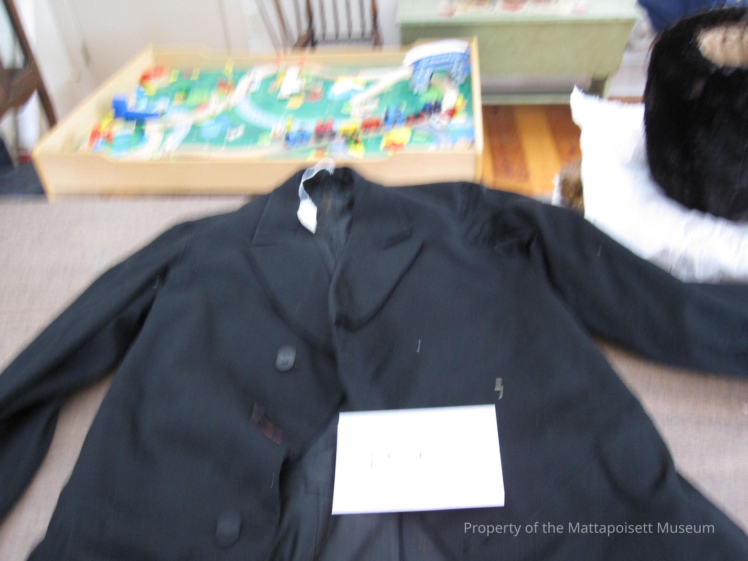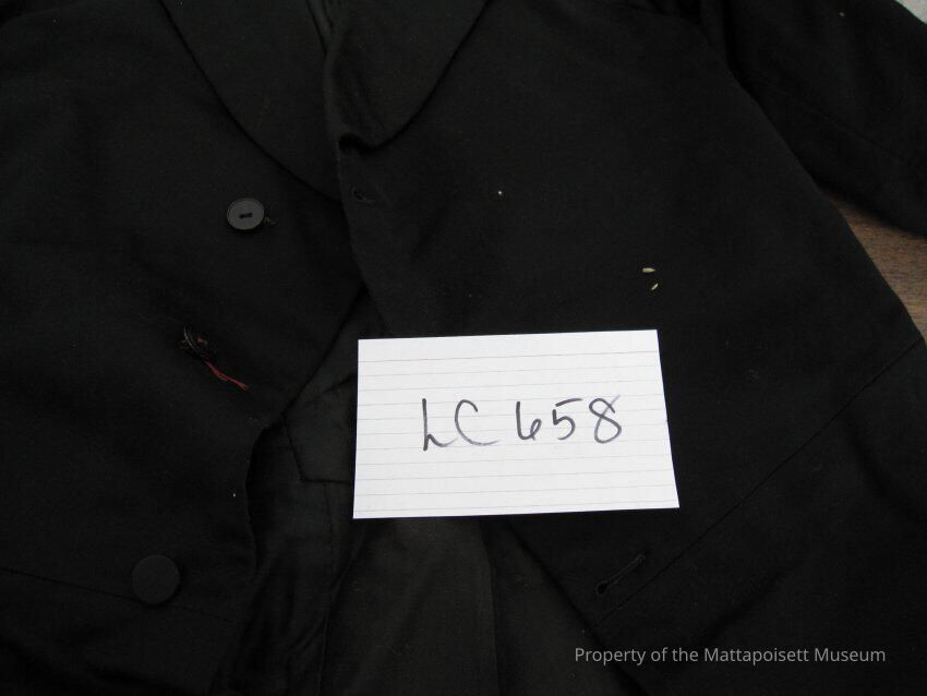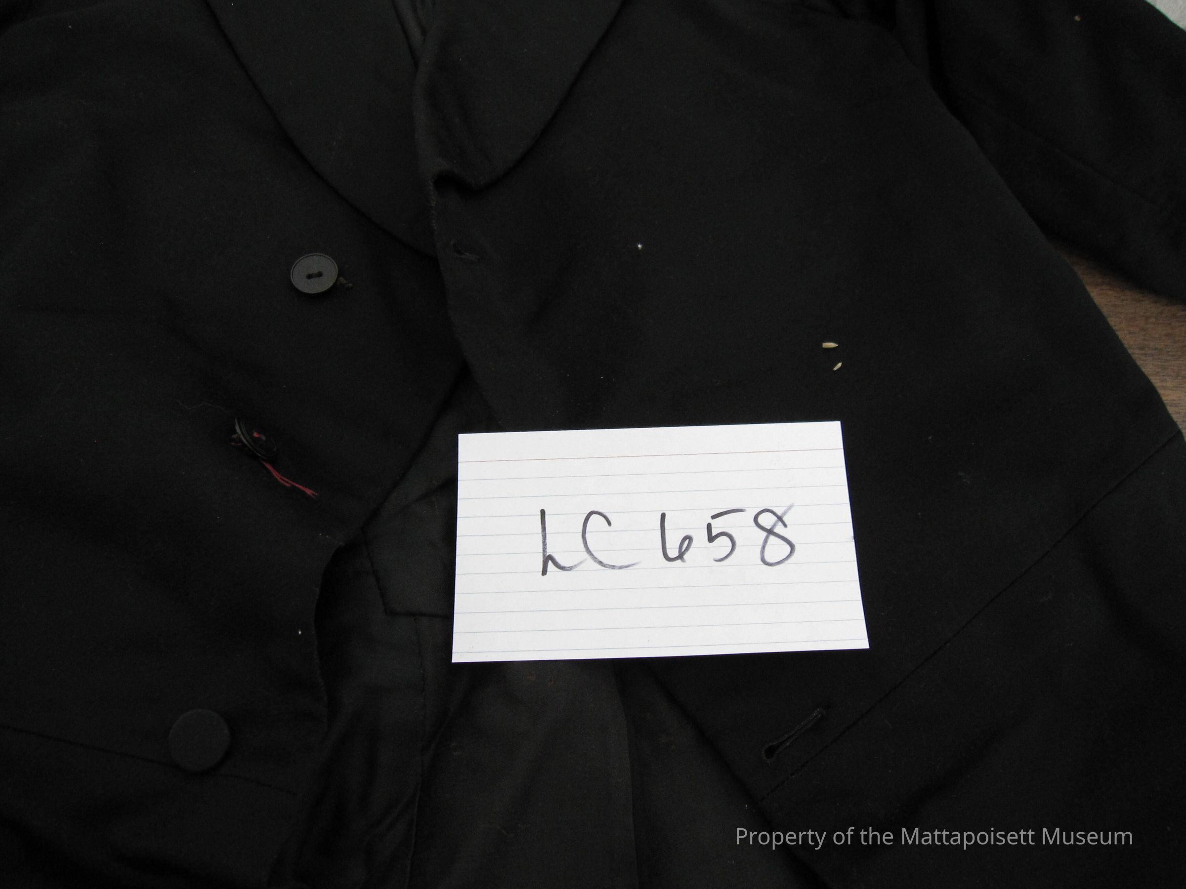 Notes: Notecard: Men's black frock coat. sent to cleaners 2/3/2004 Status: OK