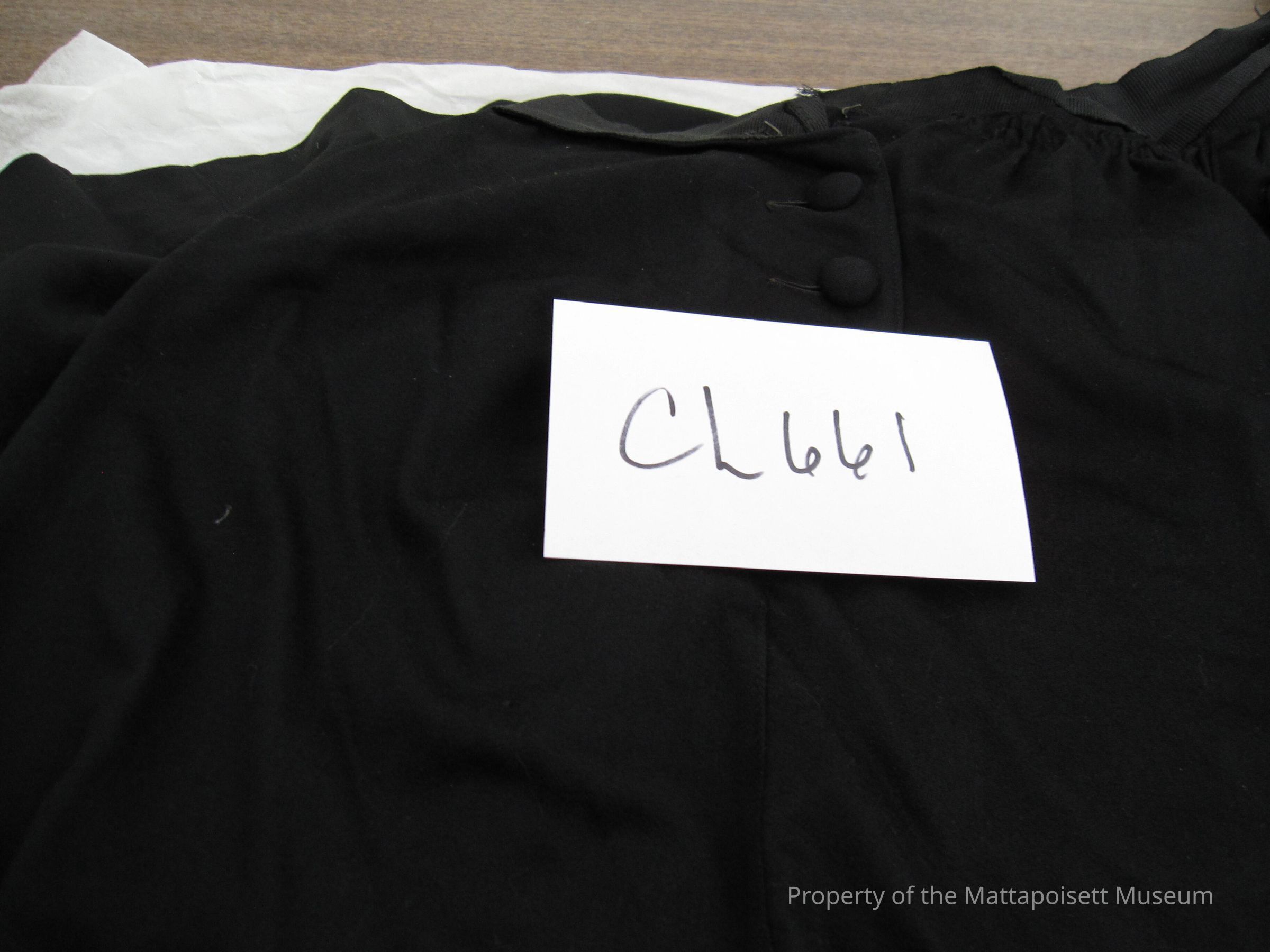 Notes: Notecard: Long black wool skirt.