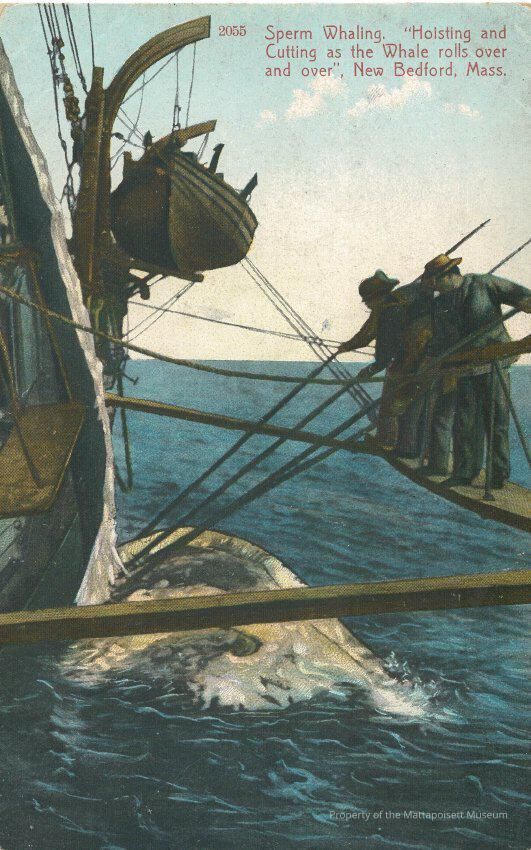 Hand-colored postcard showing Sperm Whaling, "Hoisting and Cutting as the Whale rolls over and over", New Bedford, Mass.Collection