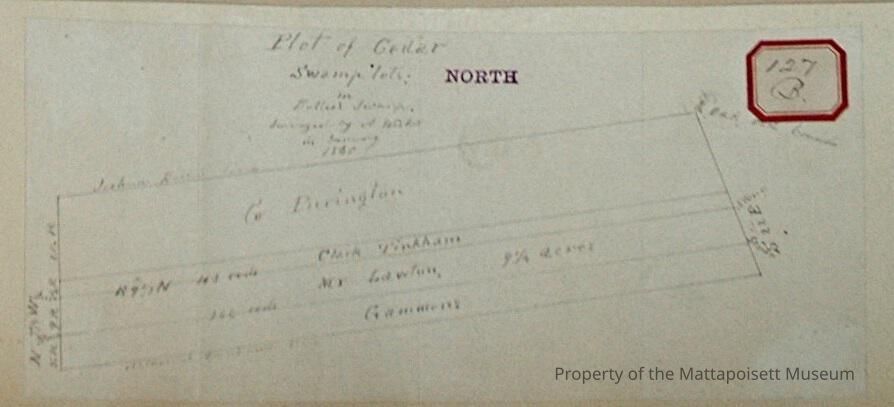 Plot of Cedar Swamp lots in Bolles Swamp. Surveyed by Ansel Weeks in January 1860. Joshua Bolles line to the north. G. Purrington lot, Clark Tinkham, Mr. Lawton (9 1/2 acres), Gammons lots, Nathaniel Dunkum's line to the south.Acquisition