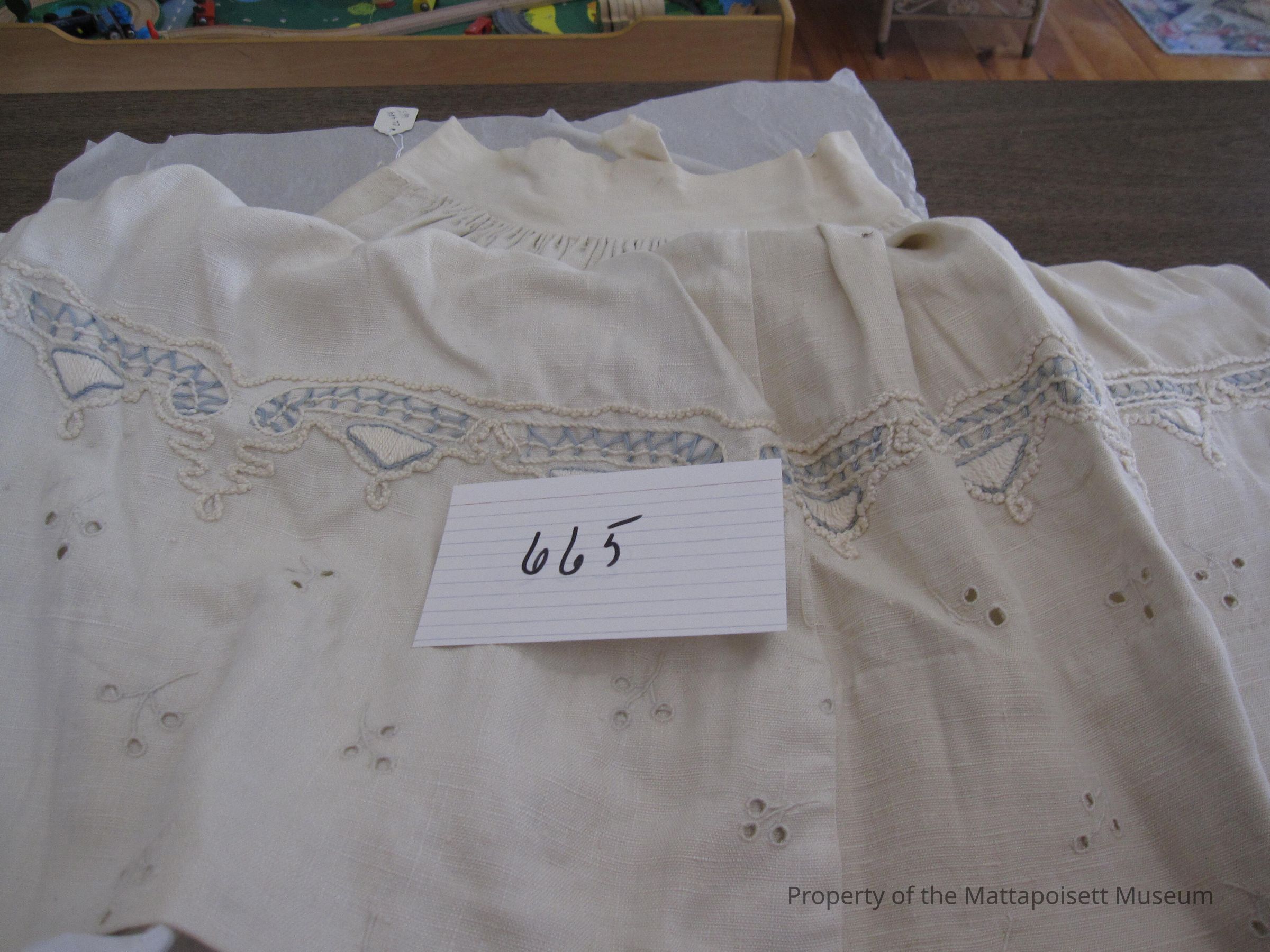Notes: Notecard: Off-white linen skirt. Eyelet trim. Blue and white crocheted trim.