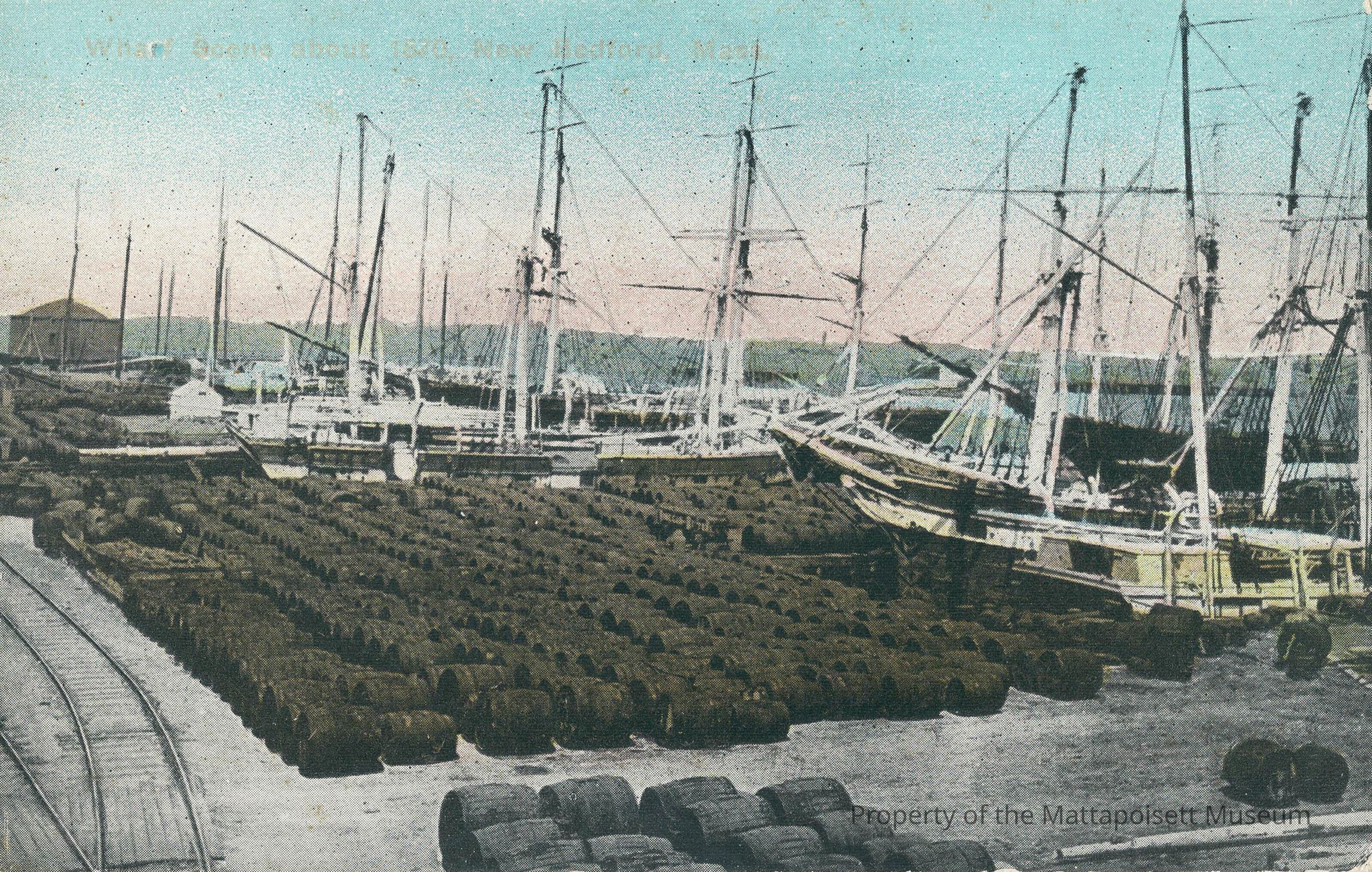 Hand-colored postcard showing Wharf scene about 1870, New Bedford, Mass.Collection