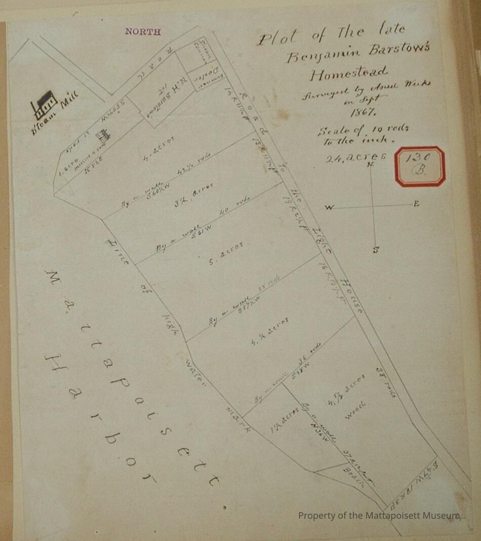Plot of the late Benjamin Barstow's Homestead. Surveyed by Ansel Weeks in September 1867. Scale of 10 rods to the inch. 24 acres at Mattapoisett Harbor on Ship Street and Road to the Light House. Split into nine sections 1. 4 5/8 acres, wood; 1 1/2 acres; 4 1/2 acres, 5 acres; 3 1/2 acres; 4 acres; Samuel (?) Dexter; Susan Cannon; N. H. Barstow's lot; 1 acre, minus 4 rods.Acquisition