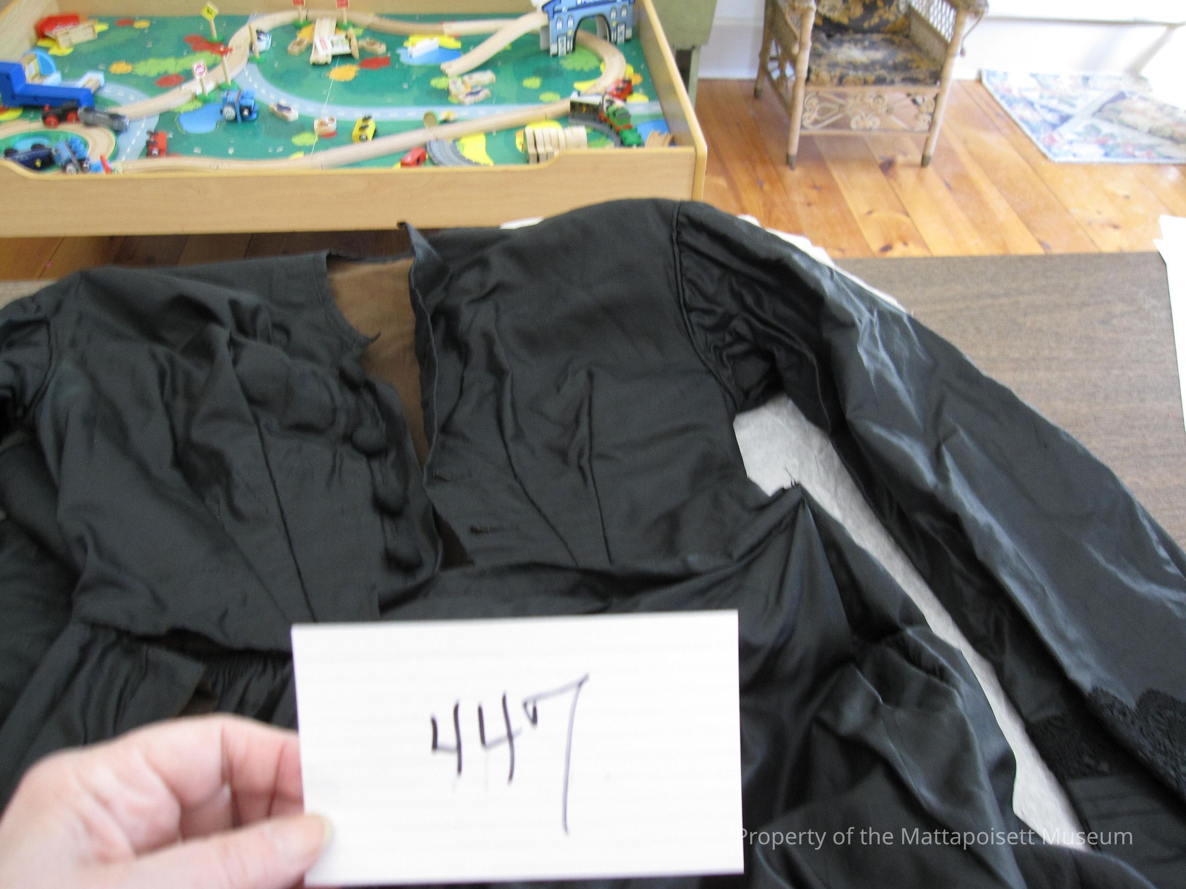 Old description: Black silk dress. Long sleeved. Calamanco lining. Lace trim on sleeves, bodice and back. Ten black and silver buttons.