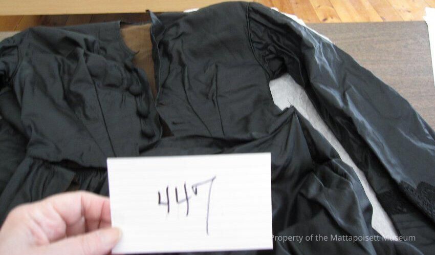 Grandma Ray's black silk dress, calmenco lining, lace trim on sleeves, bodice and back. Black and silver lining, seperate bustle to be worn in back (?).Collection