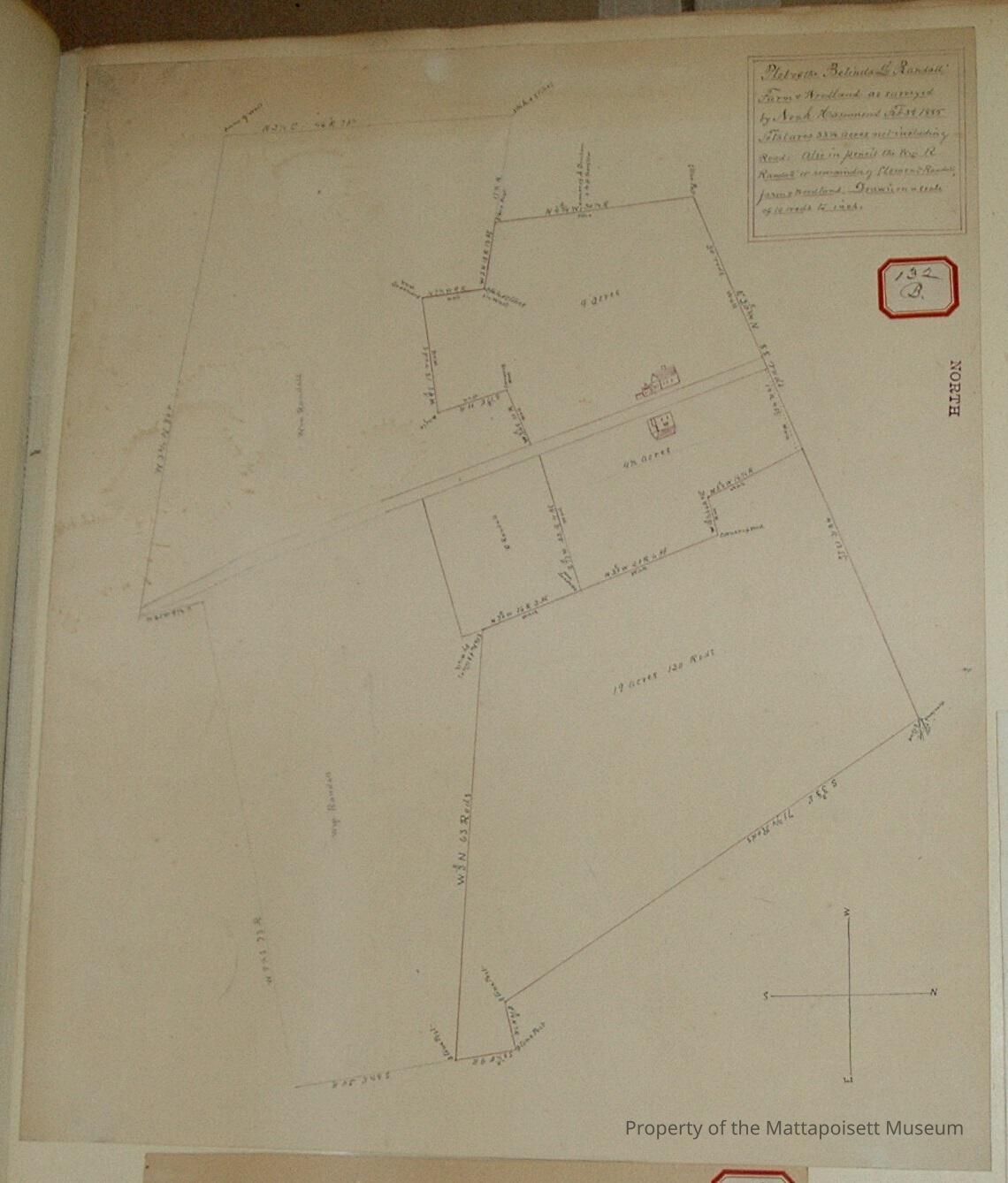 Plot of the Belinda L. Randall farm and woodland as surveyed by Noah Hammond, February 3rd 1885. Totaling 33 1/2 acres not inluding (Randall) road. Also in pencil the William R. Randall or remainer of Clement Randall farm and woodland. Drawn on a scale of 10 rods to the inch. Divided into several lots. 9 acres, 4 1/2 acres, 19 acres and 130 rods, William Randall and C. Randall lots.Acquisition