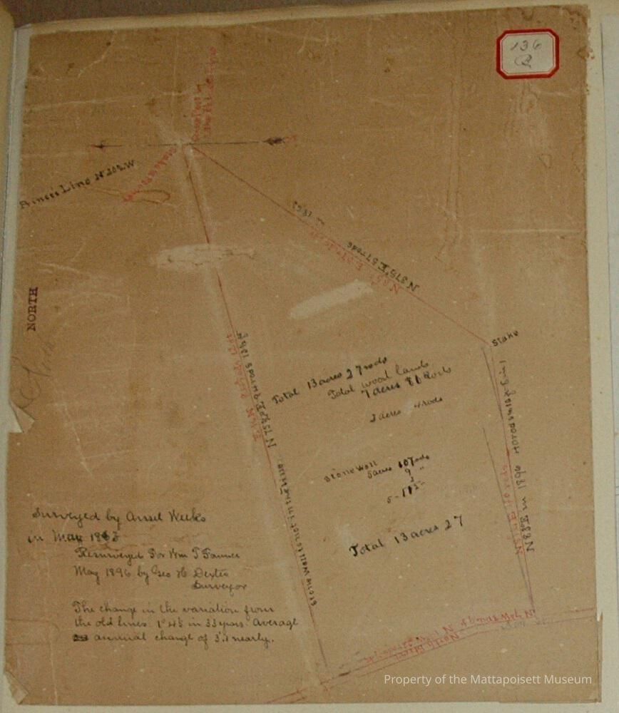 Surveyed by Ansel Weeks in May 1863. Resurveyed for William T. Faunce, May 1896 by George H. Dexter, surveyor. The change in the variation from the old lines 1 degree 4'5 in 33 years. Average annual change of 3'1 nearly. Total 13 acres, 27 rods on North Street.Acquisition