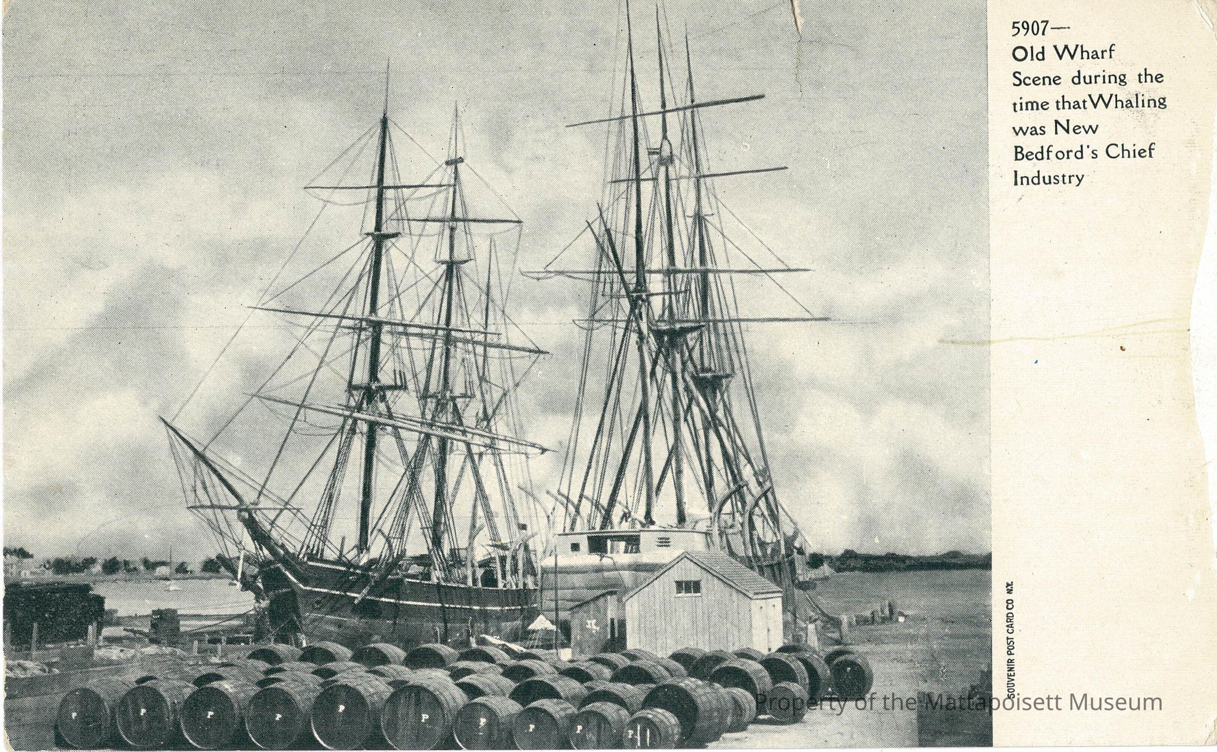 Black and white postcard showing Old Wharf Scene during the time that Whaling was New Bedford's Chief Industry.Collection
