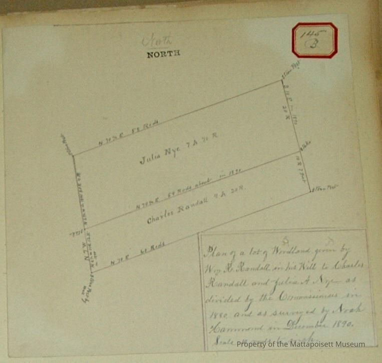 Plan of a lot of woodland given by William R. Randall in his will to Charles Randall (4 acres, 20 rods) and Julia A. Nye (7 acres, 70 rods) as divided by the Commissioners in 1880, and as surveyed by Noah Hammond in December 1890. Scale 10 rods to the inch.Acquisition