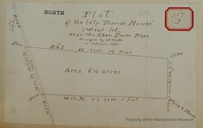 Plot of the late Thomas Howes' wood lot, near the Eben Snow place. Surveyed by Ansel Weeks in October 1863, area 6 1/4 acres. On road.Acquisition
