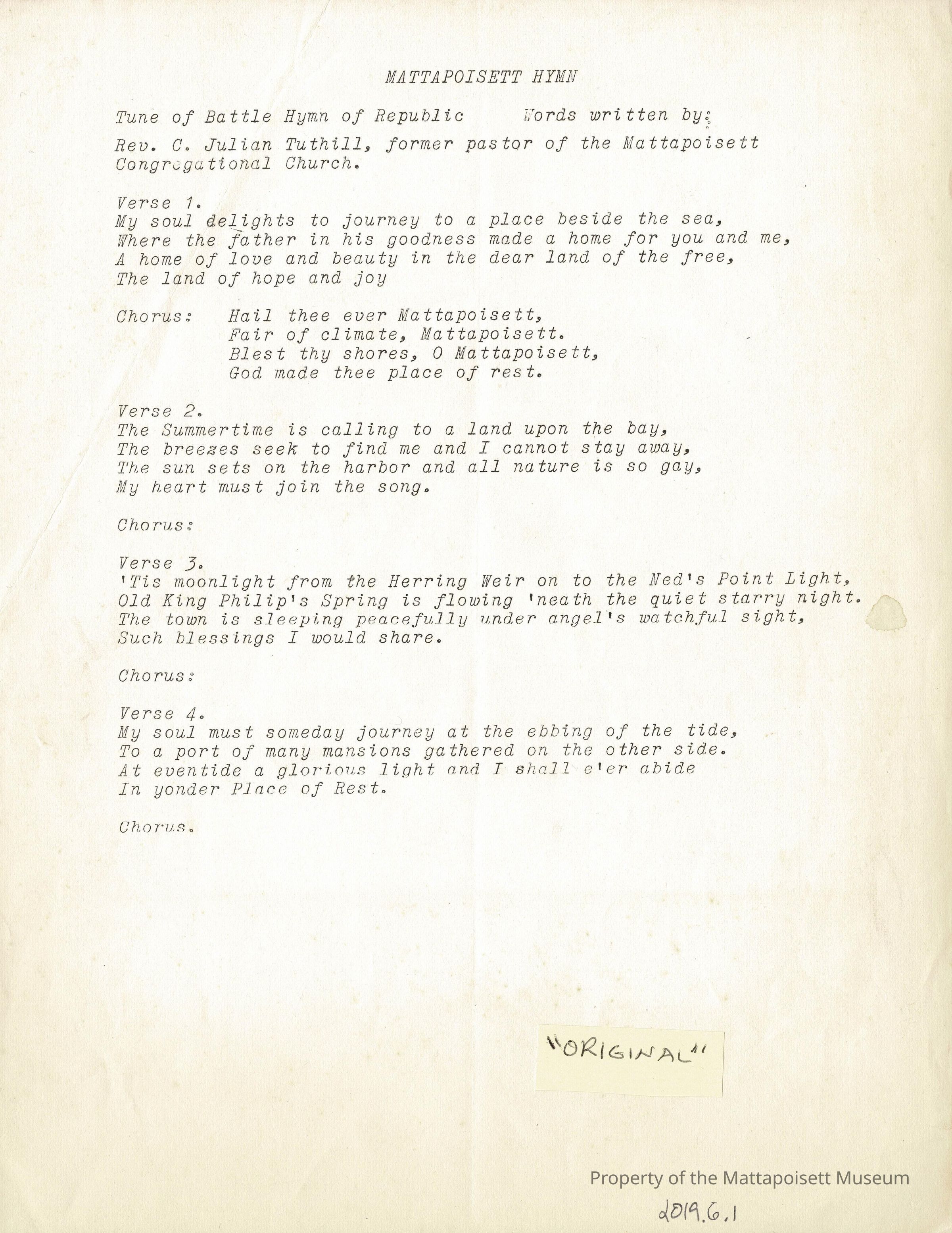 Lyrics to a song about Mattapoisett, sung to the tune of the Battle Hymn of the Republic.Collection